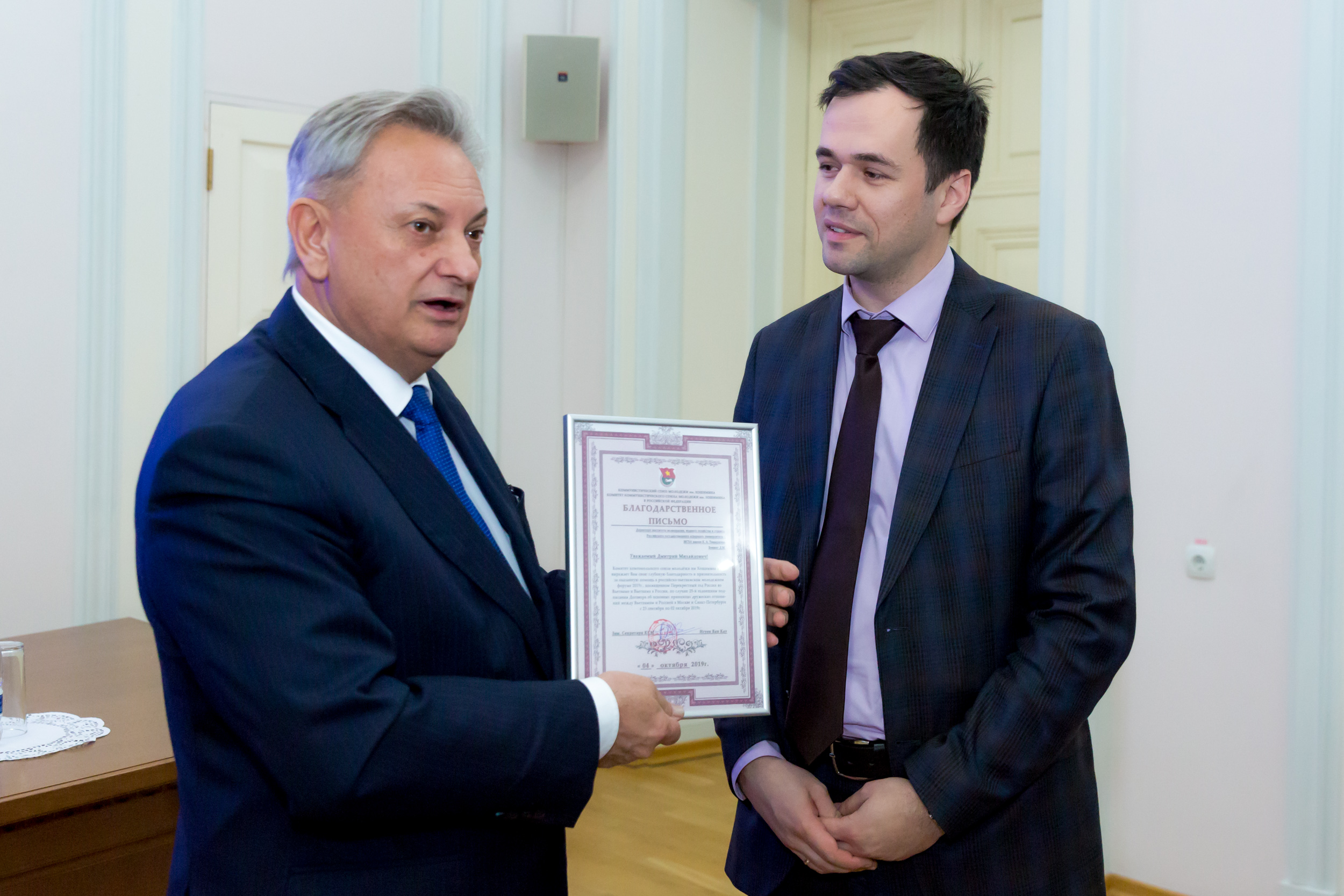 16 Декабрь / 2019Комитет комсомольского союза молодёжи имени Хошимина в РФ отметил Благодарственным письмом вклад Д.М. Бенина в проведение Российско-вьетнамского молодежного форума, ставшего одним из основных событий «перекрестного» Года России и Вьетнама.
