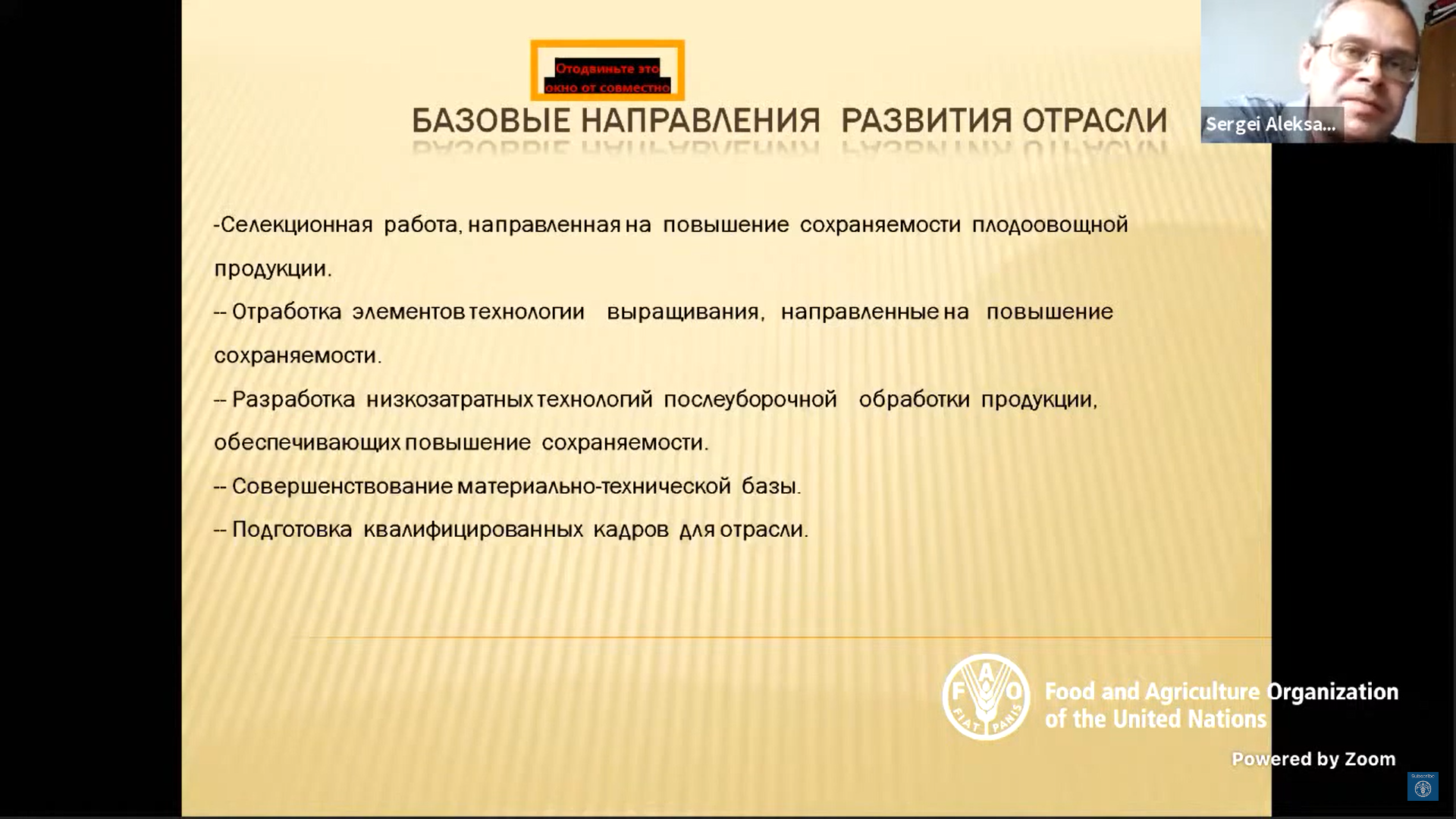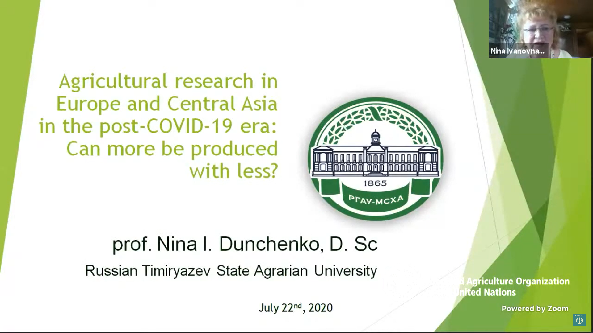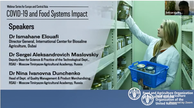 Региональное представительство ФАО в Европе и Центральной Азии провело виртуальное совещание с участием представителей исполнительной власти и научного сообщества России и зарубежных стран. На мероприятии с содержательными докладами выступили руководители кафедр технологического факультета РГАУ-МСХА - Нина Ивановна Дунченко и Сергей Александрович Масловский.