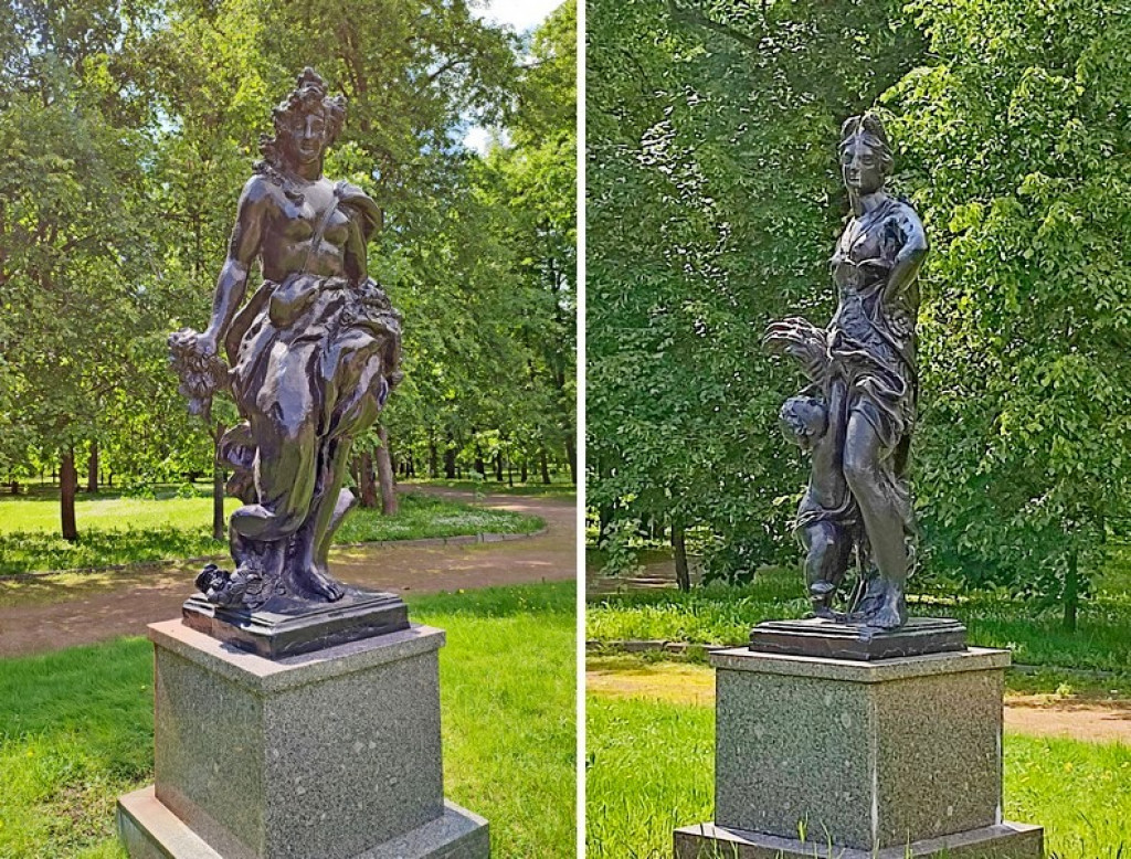 На центральной площадке парка, где в 1812 году исчезли скульптуры Карло Растрелли, сегодня вновь можно увидеть статуи, обозначающие времена года. В 17 веке сюда вернулись произведения, отлитые ещё в XVIII веке и чудом найденные в запасниках Сада им. Эти скульптуры – не просто изваяния, они вписаны в солнечный круг: Флора (весна) освещается лучами солнца, когда оно в зените, Деметра (лето) находится под солнцем в наивысшей точке своего пути, а когда солнце садится за горизонт, Дионис лишь Селен всегда остаётся без лучей солнца, символизируя свой вечный покой. В 2016 году в центре этого паркового круга установили бюст Петра I – подарок от скульптора Зураба Церетели к 150-летию академии.