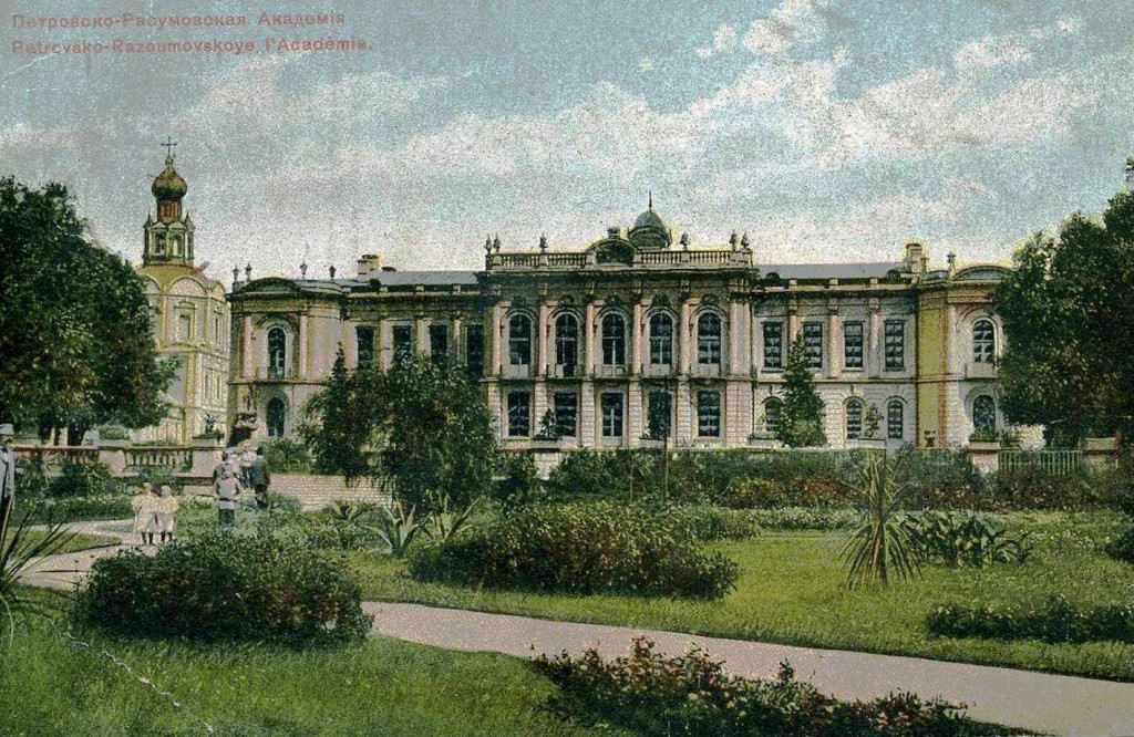 Перед этим величественным фасадом раскинулись великолепные цветники, над которыми работал сам директор академии, доктор ботаники Николай Иванович Железнов. А реставрацией всего парка в середине XIX века занимался Рихард Шредер, придавая ему уникальный облик. Парк помнит и другие утраты. В эпоху графа Разумовского территория, расположенная выше, была отделена от той, что расположена ниже, изящной оградой, украшенной 22 статуями из мрамора — 12 фигур изображали персонажей античной мифологии. Эти шедевры были утрачены без следа в период наполеоновского нашествия в 1812 году. Впоследствии территорию украшали разнообразные скульптурные и цветочные композиции.