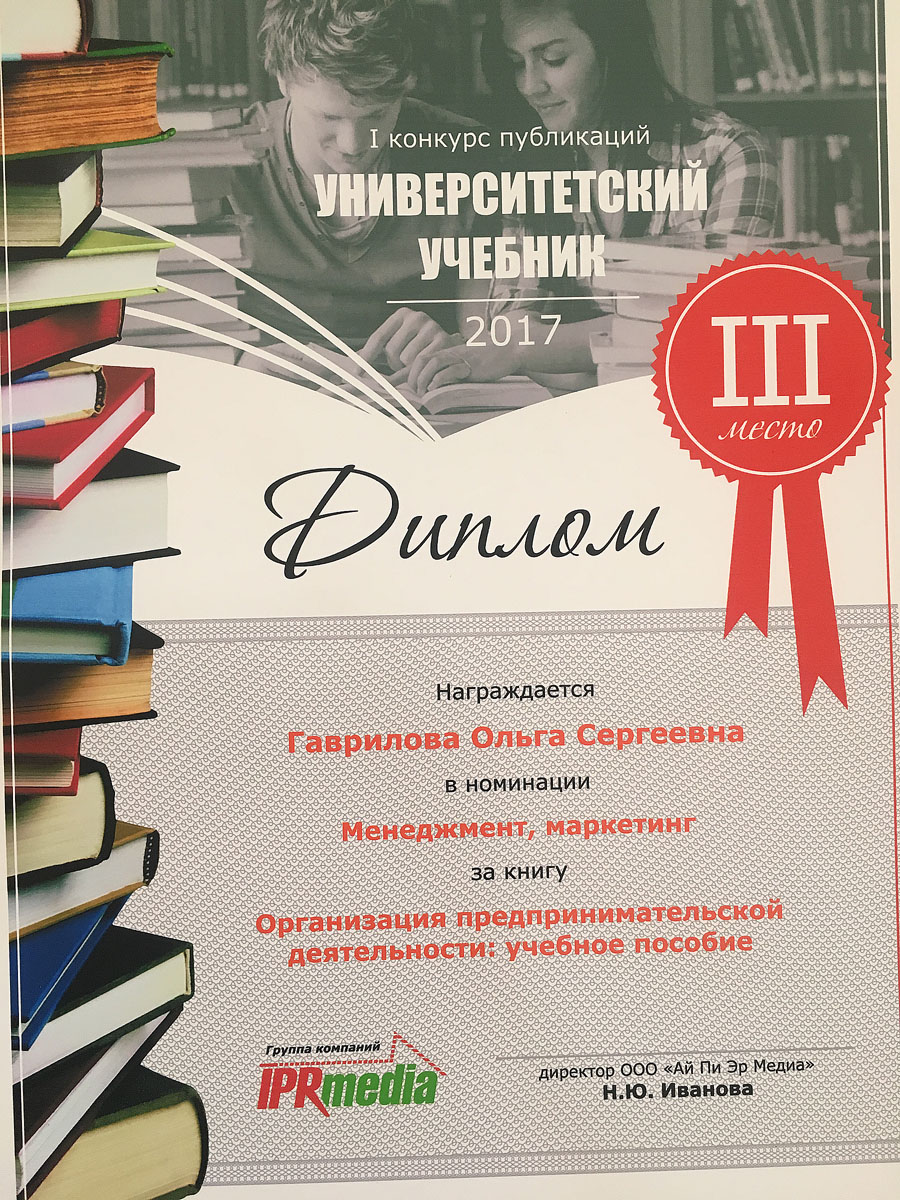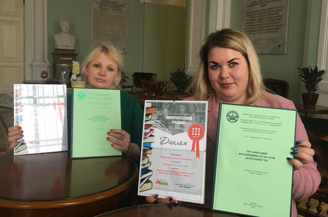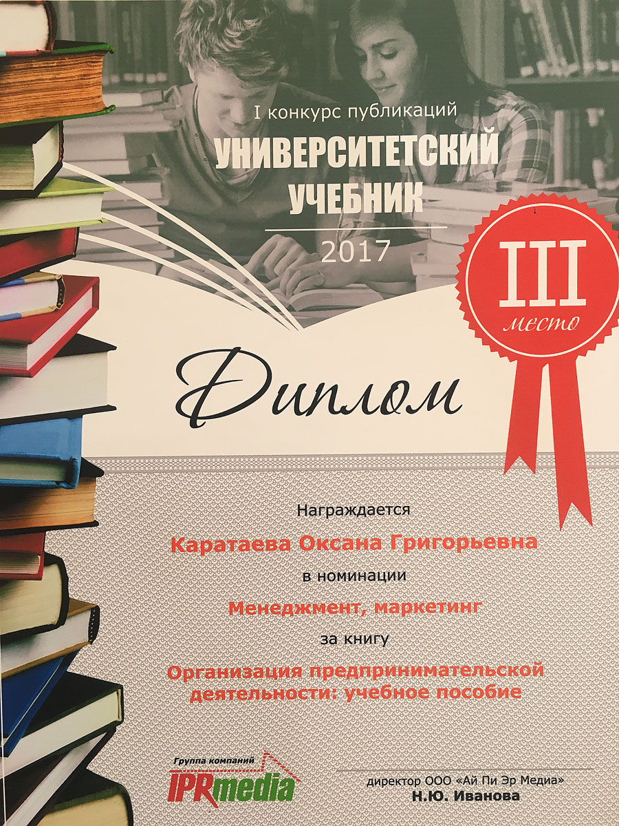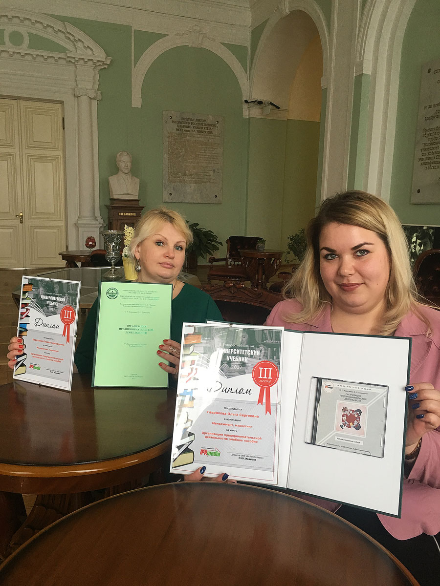 На I конкурсе публикаций «Университетский учебник-2017», проведённом ООО «Ай Пи Эр Медиа», доцент кафедры организации производства О.Г.Каратаева и старший преподаватель кафедры управления качеством и товароведения продукции О.С. Гаврилова удостоены диплома за III место в номинации «Менеджмент, маркетинг».