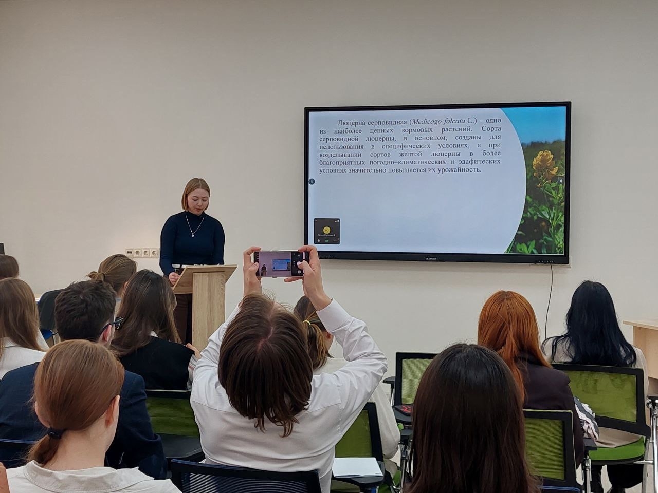 Анна Шабля выступила с докладом «Морфологические особенности и хозяйственные свойства межвидовых гибридов люцерны серповидной и изменчивой». Это важная работа целью которой является объединение полезных свойств разных видов люцерны для создания принципиально новых, более продуктивных и устойчивых форм.