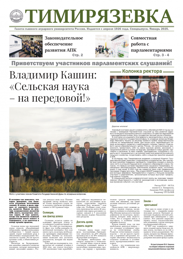 На площадке главного аграрного вуза страны проходят парламентские слушания Комитета Государственной Думы по аграрным вопросам. Депутаты, представители федеральных и региональных органов исполнительной власти, научно-экспертного сообщества, отраслевых союзов и ассоциаций обсуждают развитие кадрового потенциала АПК России. В честь представительного события вышел в свет специальный выпуск университетской газеты.