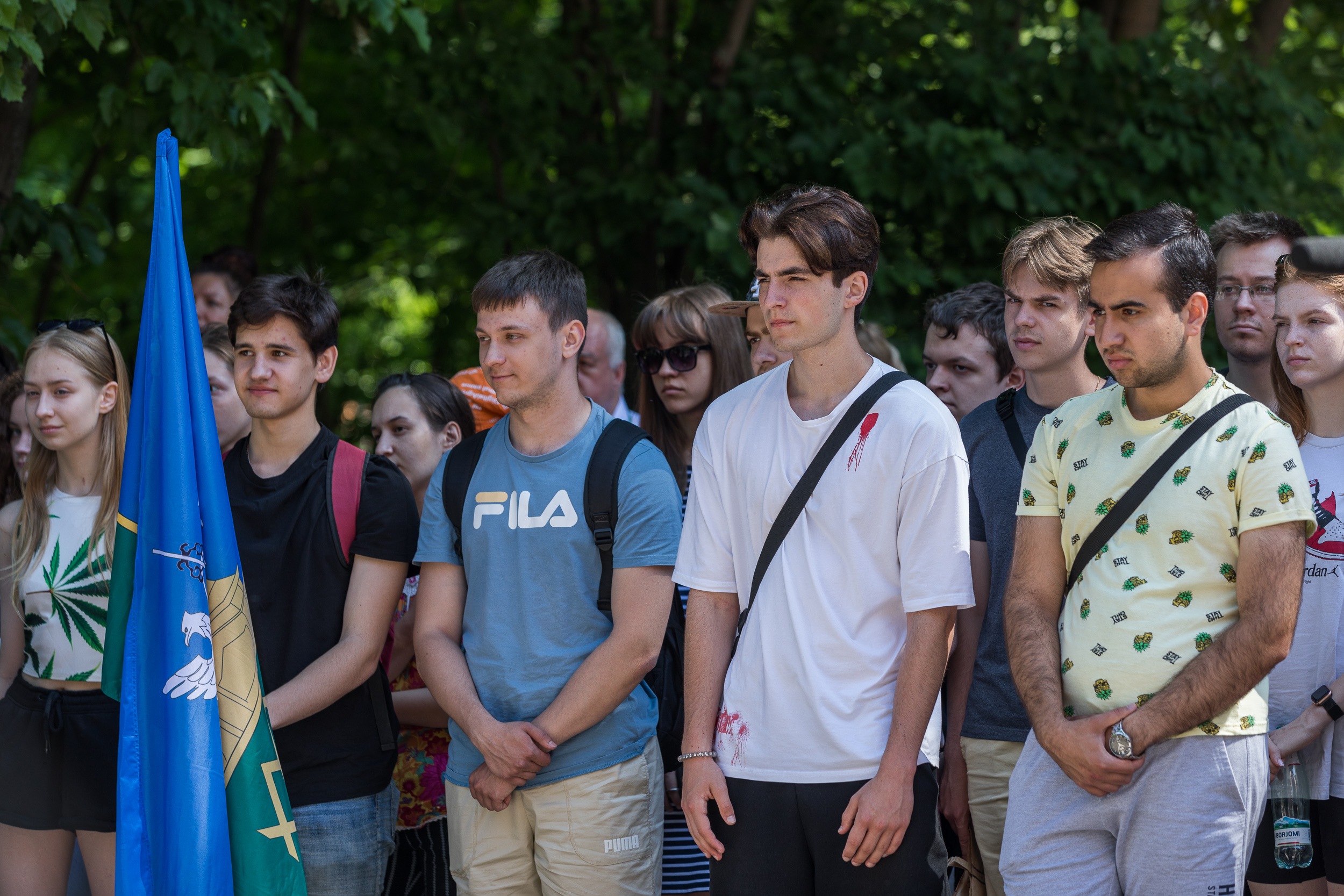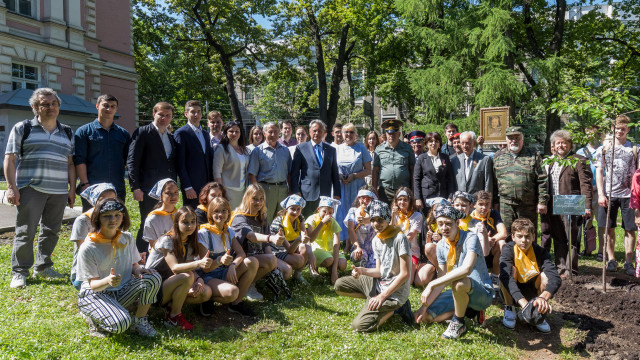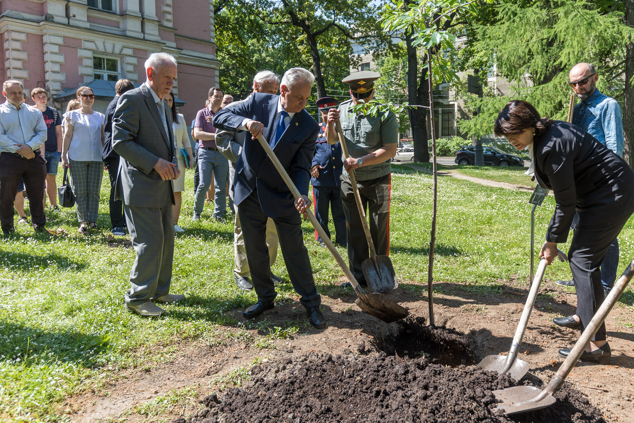 Участники торжественной церемонии, посвящённой 100-летию нелегальной разведки, приняли участие в посадке именного дерева в честь легендарного выпускника университета.