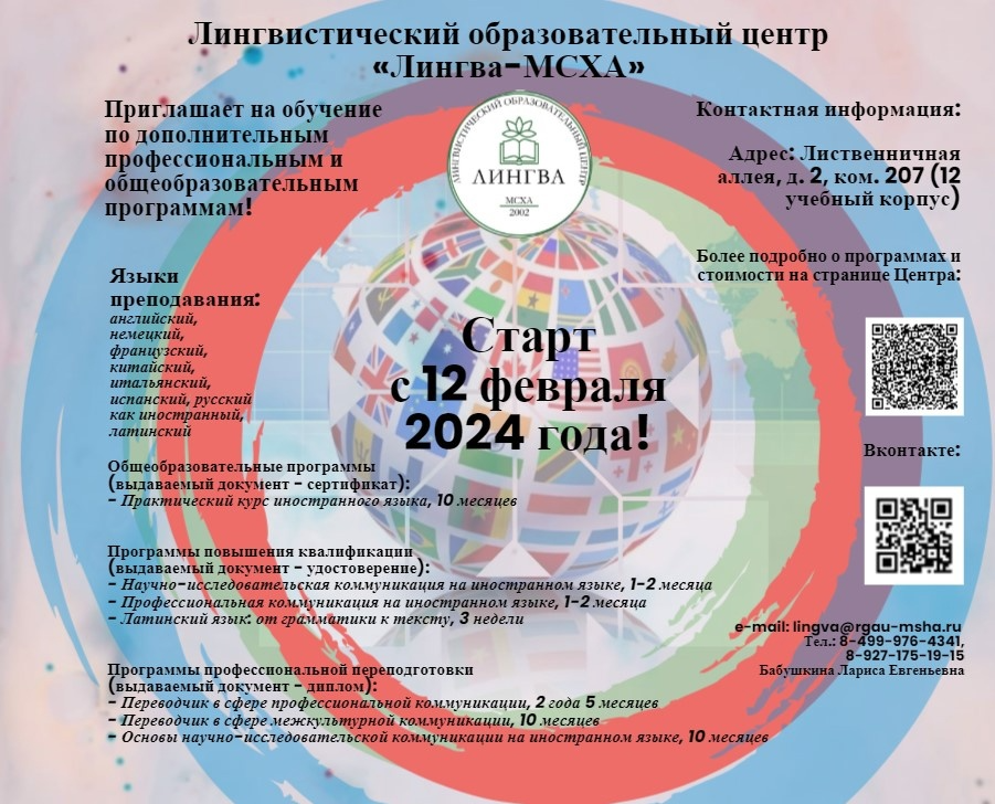 В современном мире актуально знать иностранный язык, и желательно не один. Центр "Лингва-МСХА" готов качественно обучить английскому, немецкому, французскому, китайскому, итальянскому, испанскому, русскому как иностранному и даже латинскому. Лингвистический центр университета приглашает освоить общеобразовательные программы, программы повышения квалификации и профессиональной переподготовки.