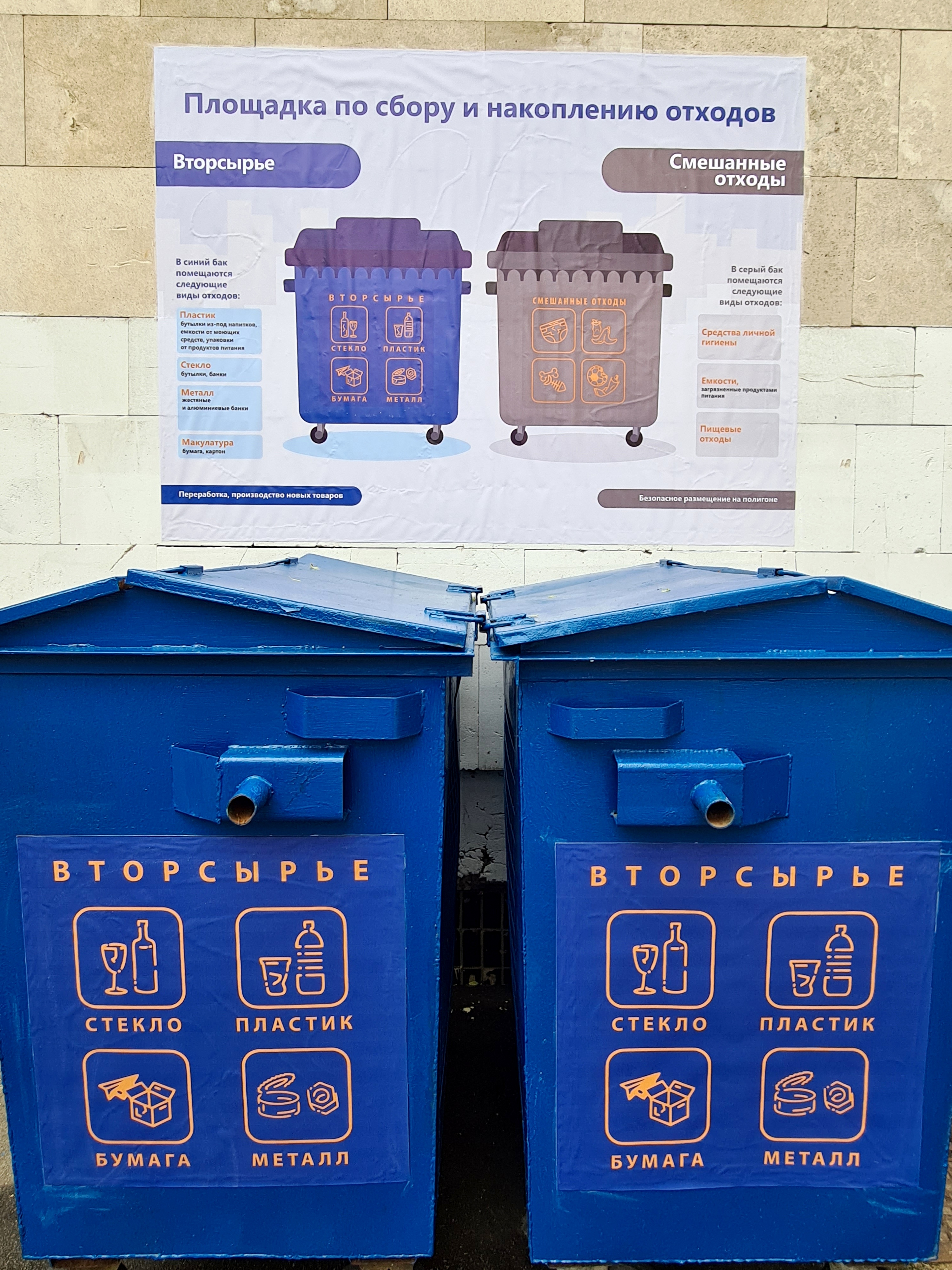 – Контейнеры с синей наклейкой и надписью «Вторсырьё» предназначены для отходов, которые подлежат переработке. Бумагу, пластик, стекло, металл следует выбрасывать именно в них. В контейнеры с серой наклейкой и надписью «Смешанные отходы» можно бросать всё остальное: пищевые отходы, средства личной гигиены, неперерабатываемые ёмкости из-под продуктов питания и другое.