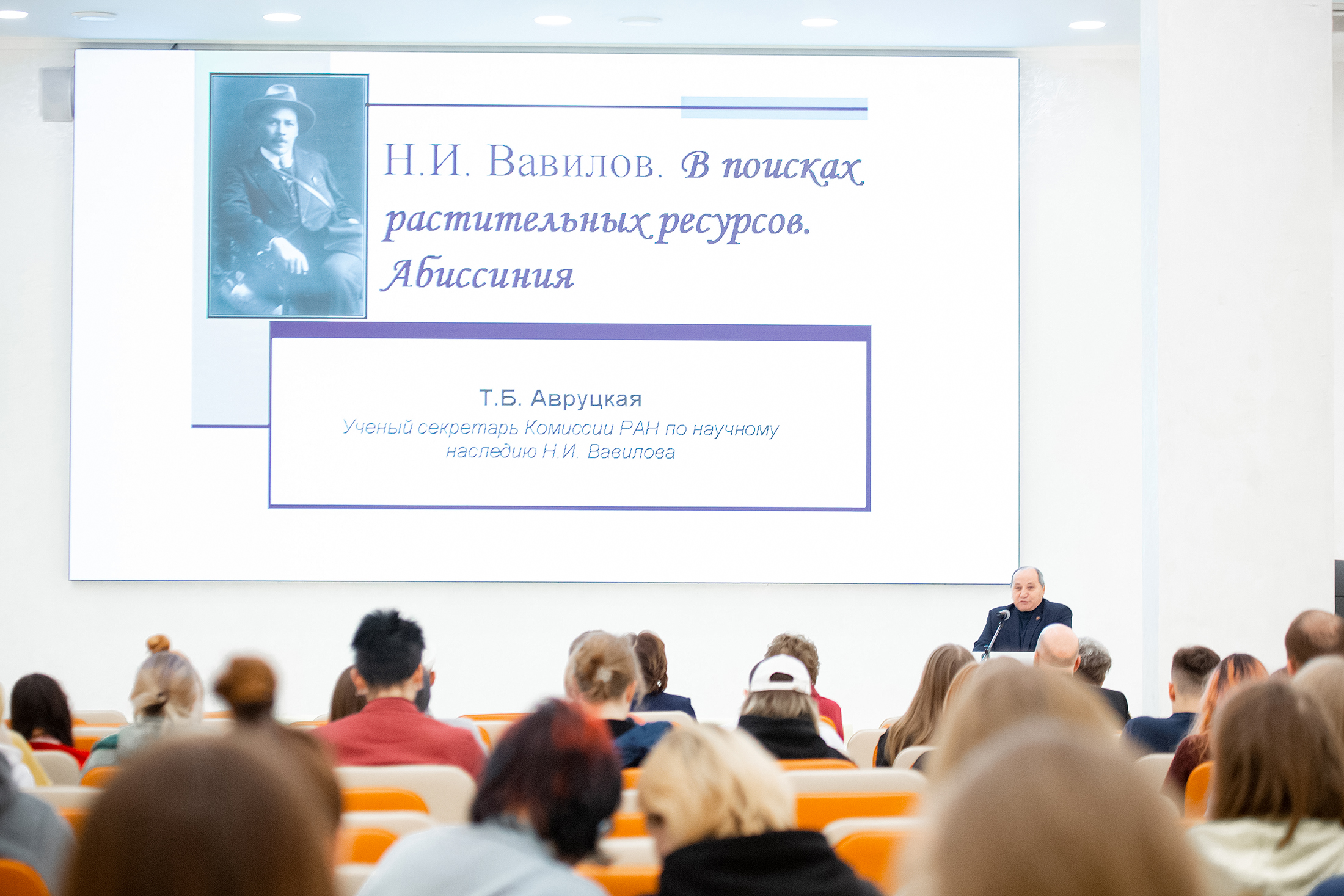 С научным докладом «Абиссиния. К 95-летию экспедиции Н.И. Вавилова» выступила ученый секретарь комиссии по сохранению и разработке научного наследия РАН, старший научный сотрудник Института общей генетики РАН, хранитель мемориального кабинета-музея академика Вавилова – Татьяна Борисовна Авруцкая.
