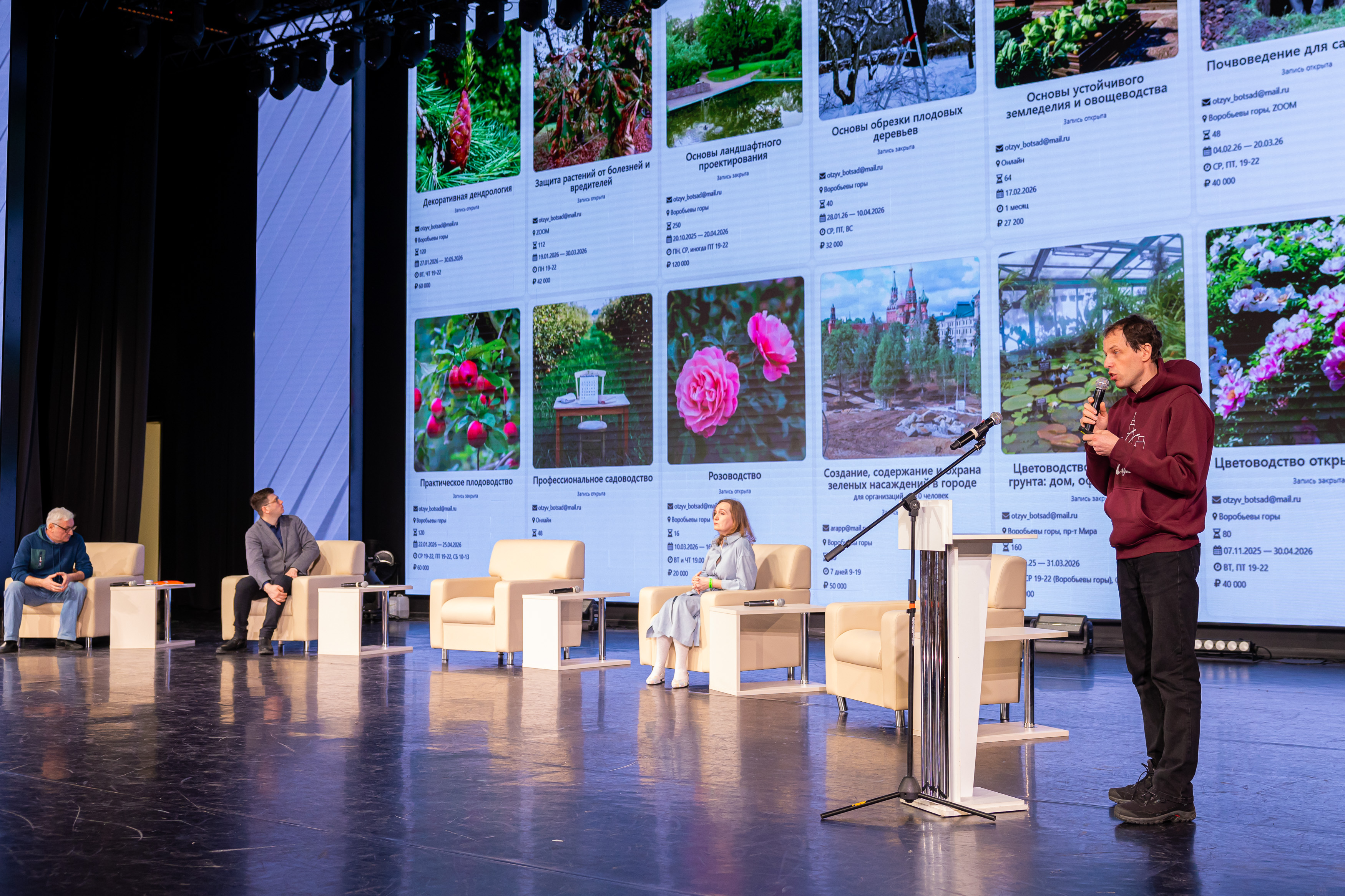 Среди ярких выступлений были презентации Виктории Самгиной о менеджменте сада как новом подходе к уходу, Елены Стенюшкиной о проекте как программе развития сада, Евгении Моргуновой о живом мульчировании и Полины Андреевой о роли плодовых культур в ландшафтном дизайне. Вопросы почвоведения осветила Ольга Гончарова, а Дмитрий Белозеров рассказал о разумном питании растений.