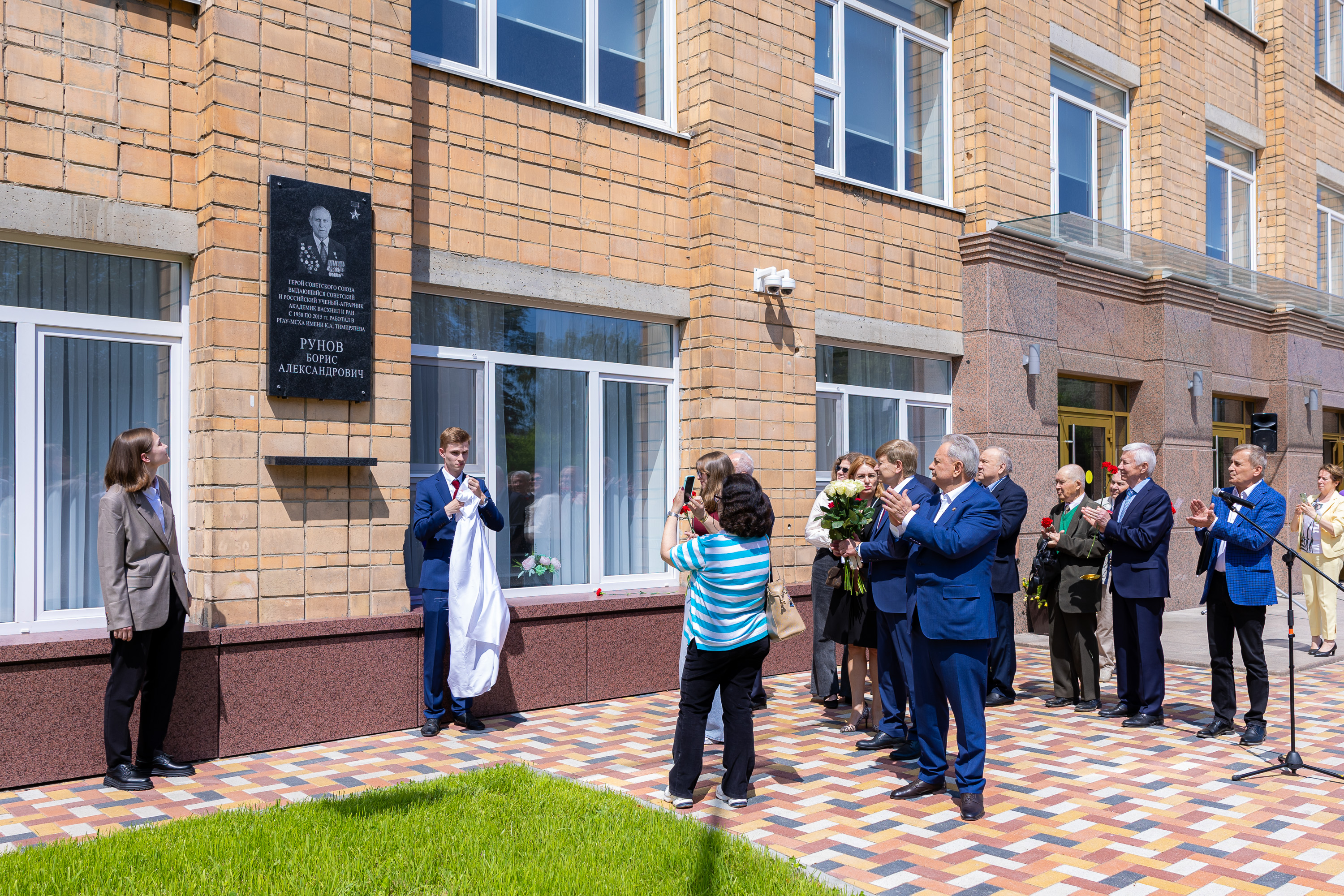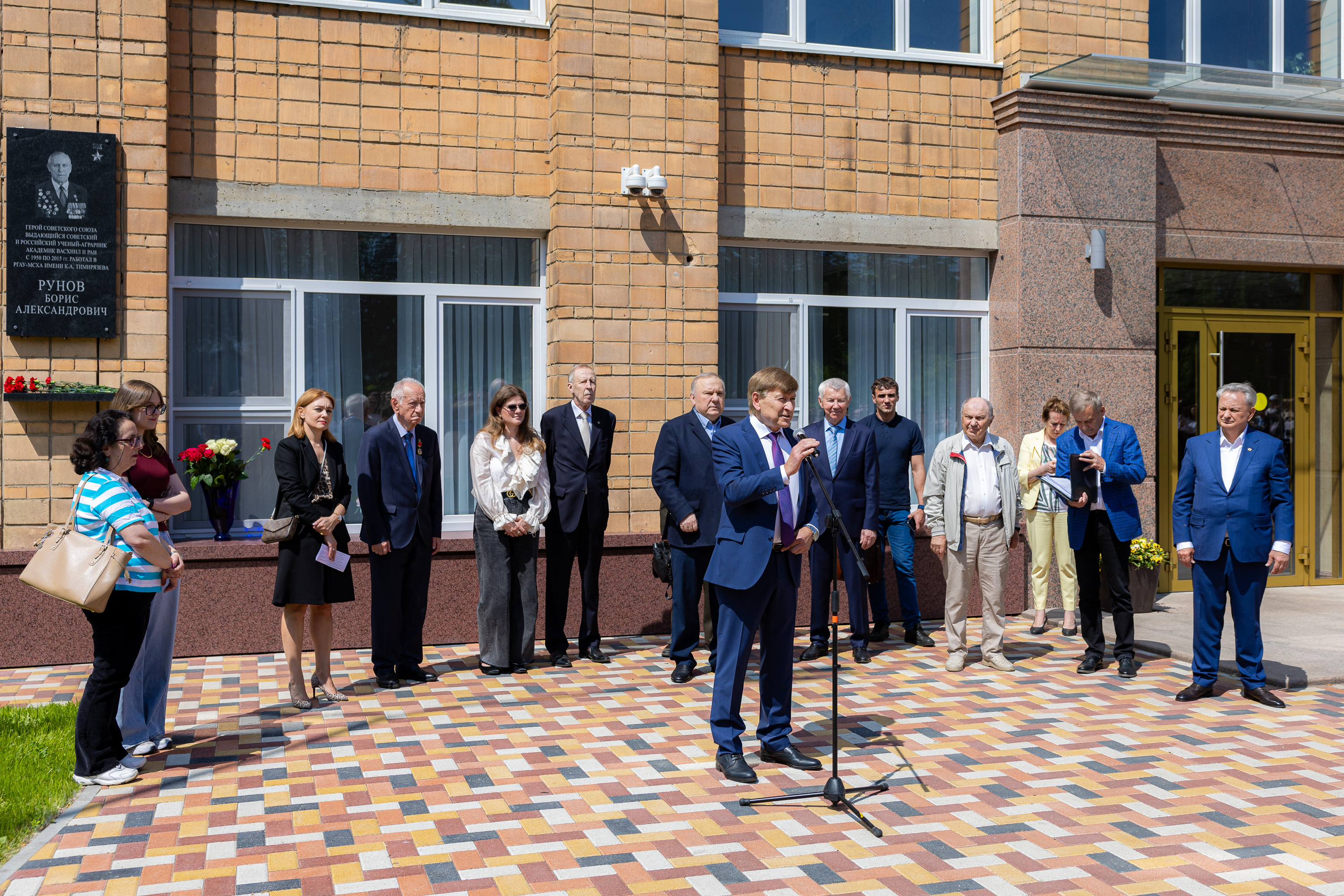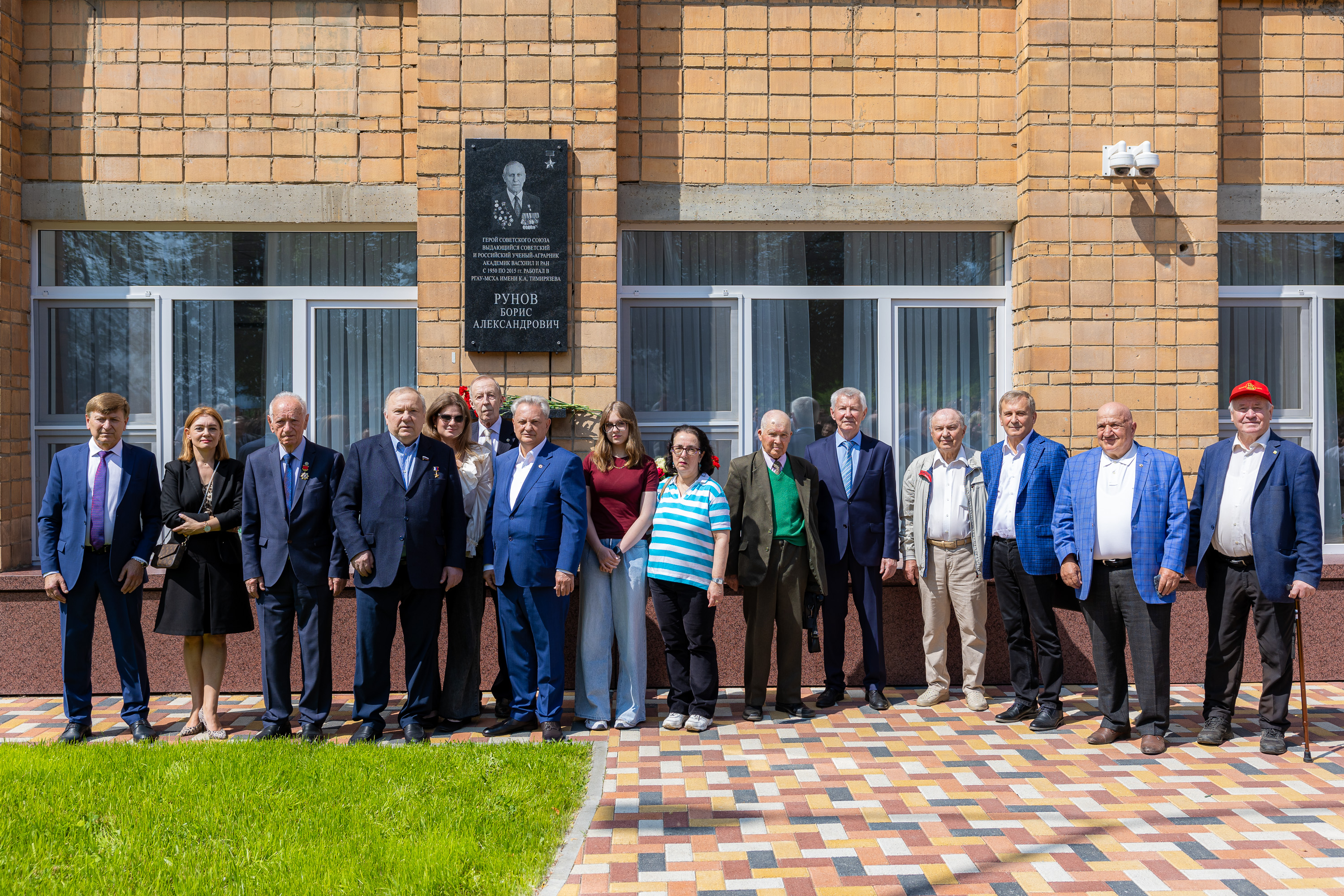 03 Июнь / 2025На торжественном открытии мемориальной доски, установленной в честь Героя Советского Союза, присутствовали студенты, преподаватели и почётные гости. В числе приглашённых были ректор РГАУ-МСХА имени К.А. Тимирязева, академик РАН, профессор Владимир Иванович Трухачев; депутат Государственной Думы, генерал-полковник ВС РФ, Герой Российской Федерации Владимир Анатольевич Шаманов; академик-секретарь отделения сельскохозяйственных наук РАН Яков Петрович Лобачевский и другие почётные гости, включая сына Бориса Александровича Валерия Борисовича Рунова.