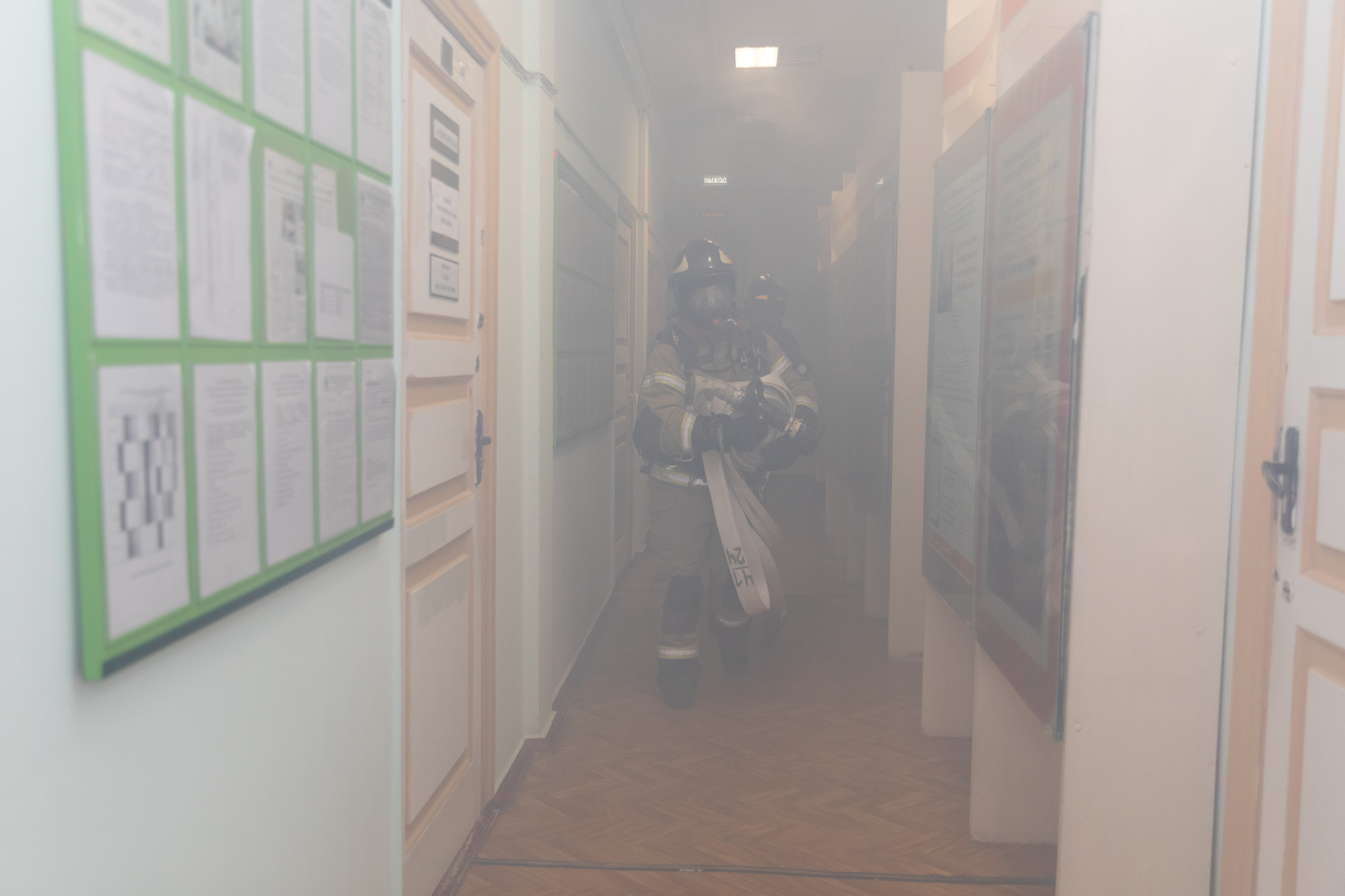 Пожарные подразделения провели разведку в зоне условного задымления, обнаружили условный очаг возгорания, приняли меры по спасению оставшихся в здании двух студентов и по предотвращению распространения огня.