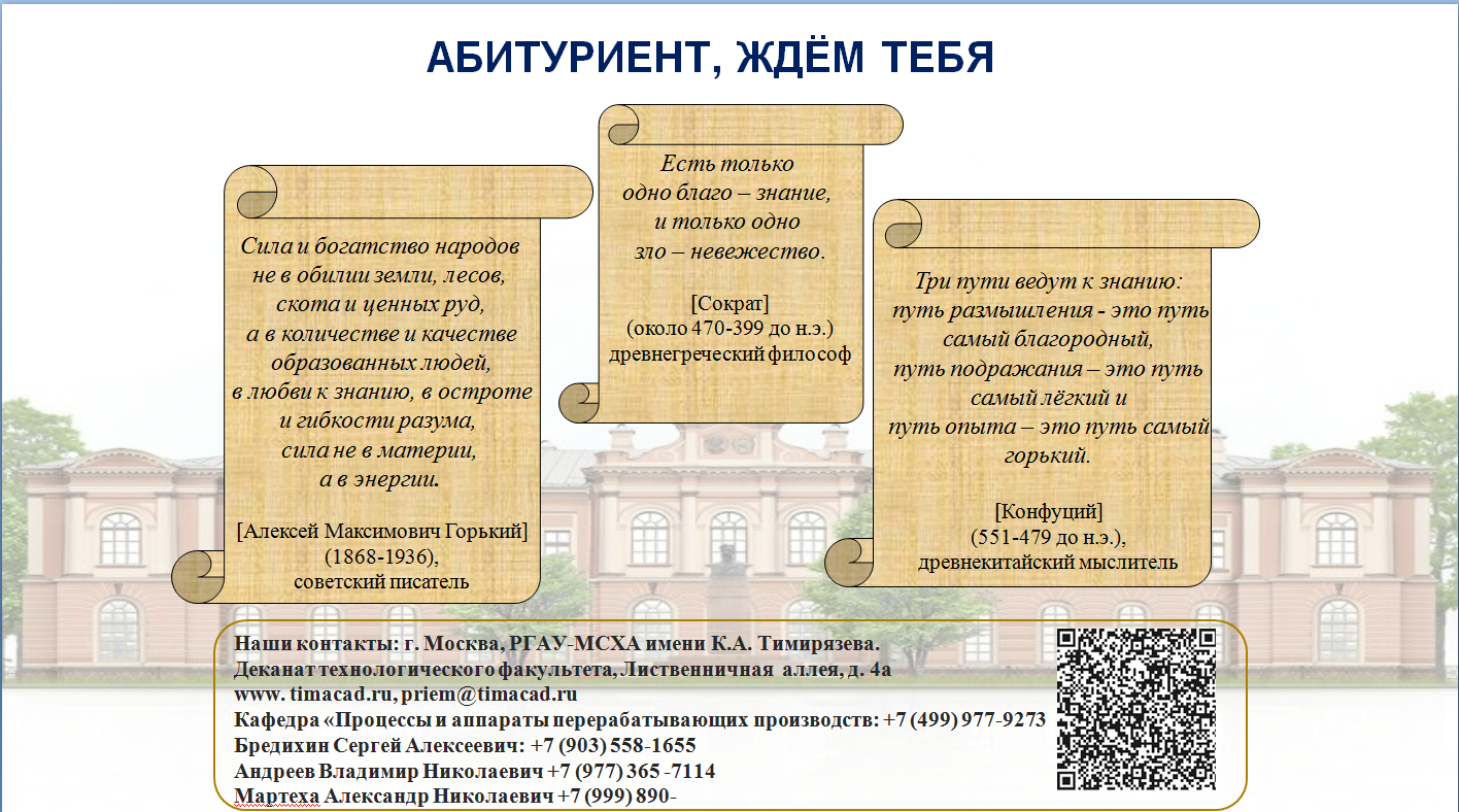 Кафедра регулярно проводит профориентационные мероприятия. Необходимо отметить, что выпускники кафедры работают на ведущих предприятиях пищевой отрасли: Kieselmann, БЕГАРАТ, Молмаш и т.д.