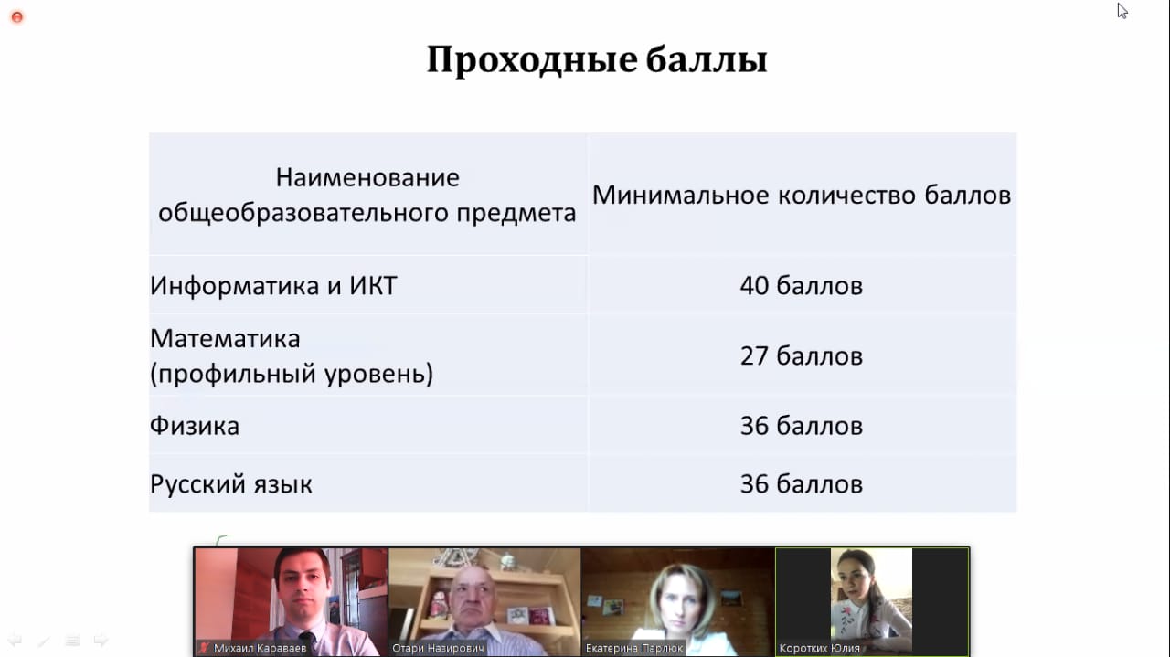 О контрольных цифрах приёма, количестве бюджетных мест, порядке их получения и проходных баллах для поступления слушатели узнали от заместителя директора по практике и профориентационной работе ИМЭ имени В.П. Горякина Юлии Сергеевны Коротких. Она пояснила особенности подачи документов в электронном виде.