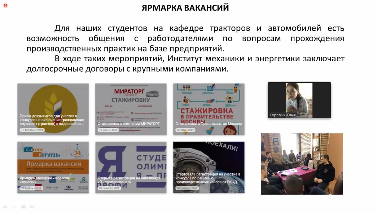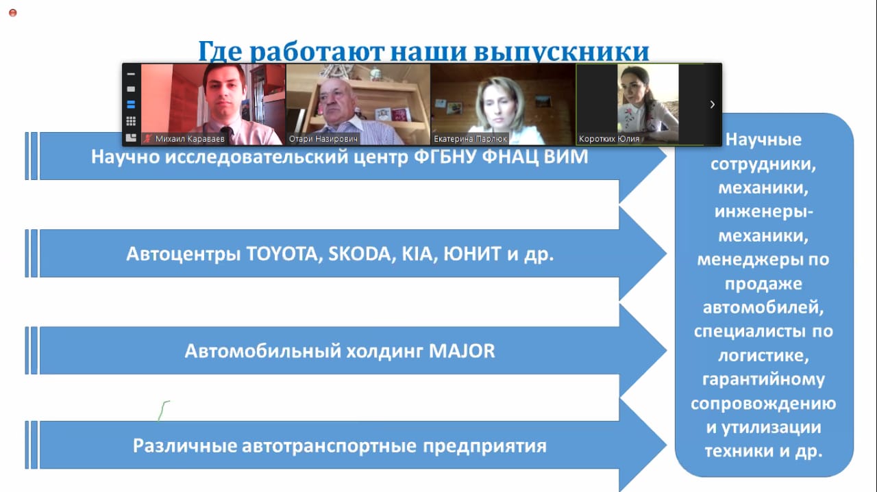 Кроме того, на вебинаре абитуриенты узнали об успешных выпускниках Института механики и энергетики имени В.П. Горячкина, работающих на крупнейших автотранспортных предприятиях, в ведущих автомобильных холдингах и научно-исследовательских центрах.