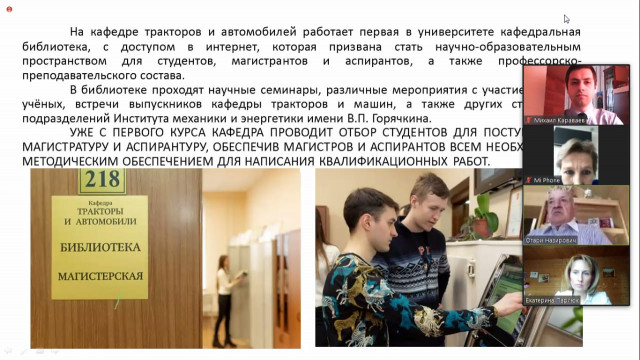 В формате видеоконференции со слушателями пообщался заведующий кафедрой, Академик РАН, профессор Отари Назирович Дидманидзе. Он познакомил слушателей с направлениями подготовки, профессорско-преподавательским составом кафедры и перспективами развития инженерной отрасли. Учёный отметил, что основными направлениями научной деятельности для будущих студентов станут ресурсосбережение в сельскохозяйственном производстве, рациональное использование транспорта, улучшение эксплуатационных показателей автомобилей путём совершенствования охлаждающих систем.