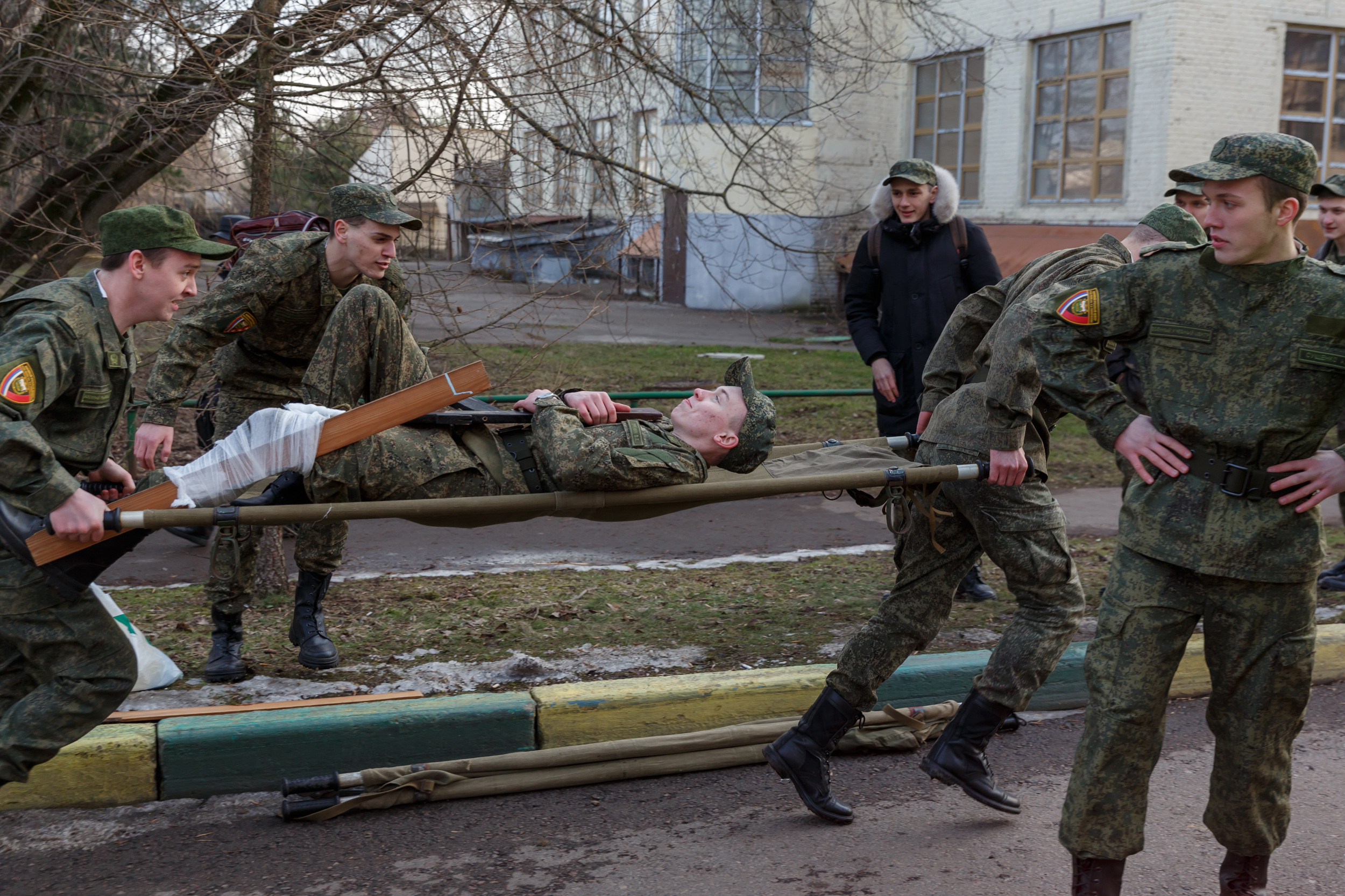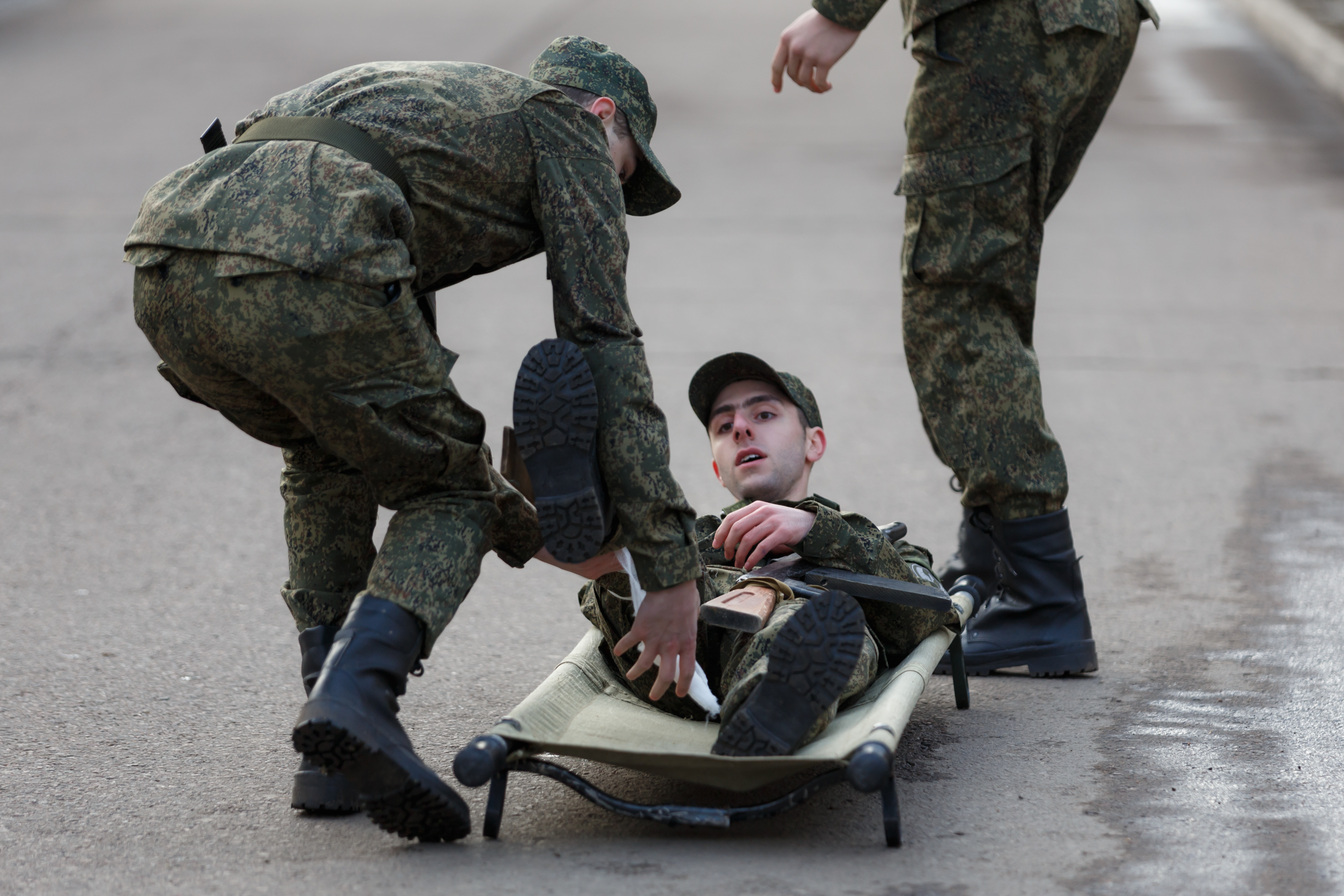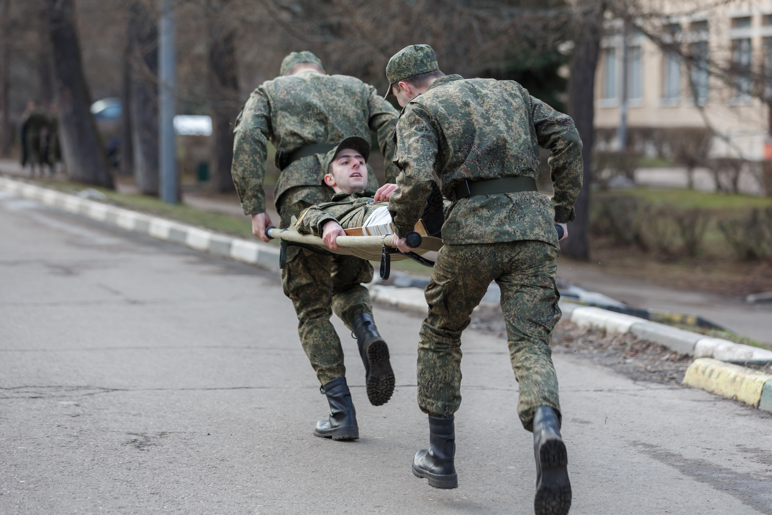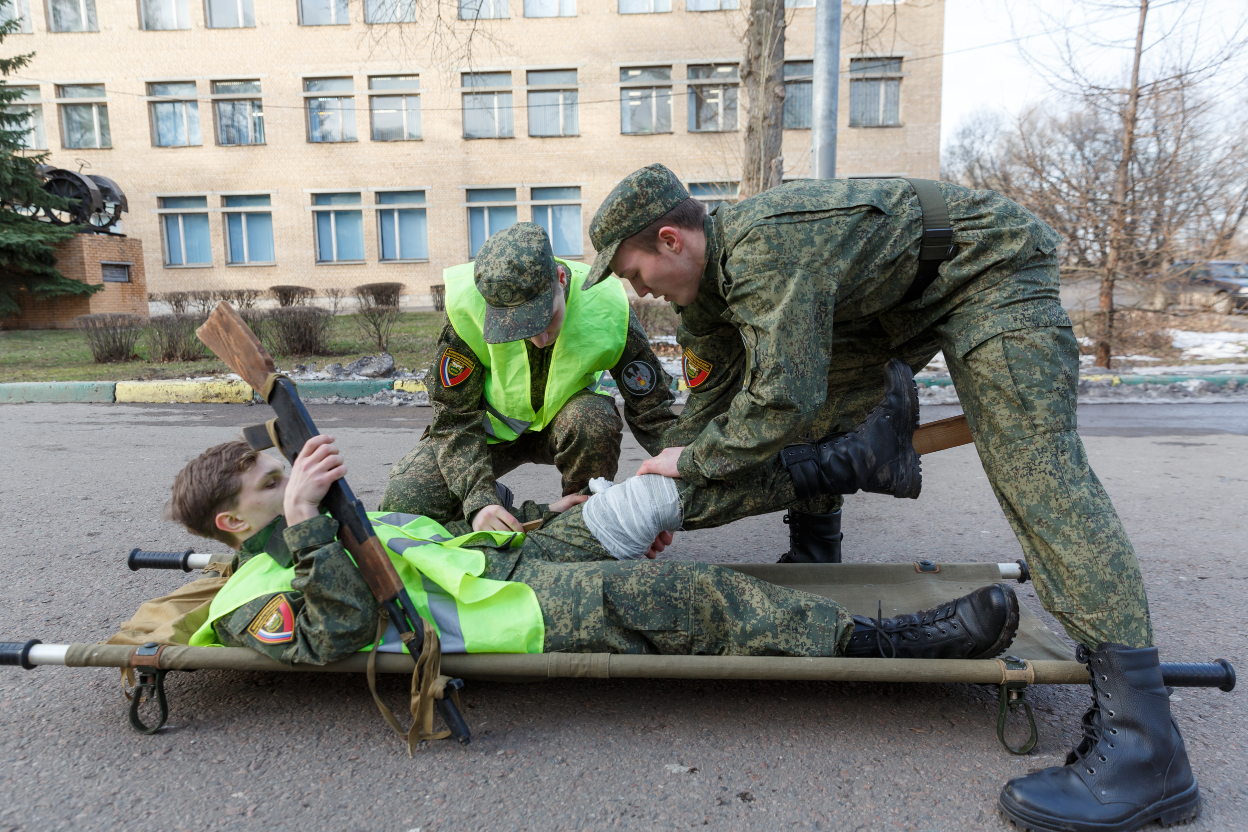 Последний этап – переноска «раненого»: двое участников перемещали на носилках третьего члена команды на расстояние 25 метров на скорость.