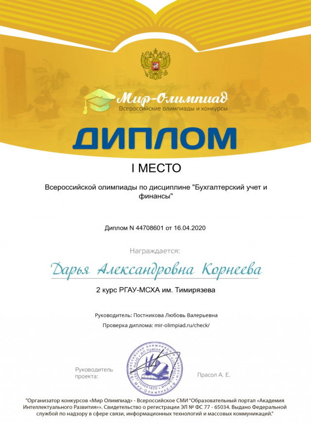 Студентка группы 201 Корнеева Дарья заняла 1 место  в олимпиаде по дисциплине «Бухгалтерский учет и финансы», в которой участвуют студенты 1-5 курсов образовательных учебных заведений РФ, стран СНГ. Олимпиада проводится дистанционно.