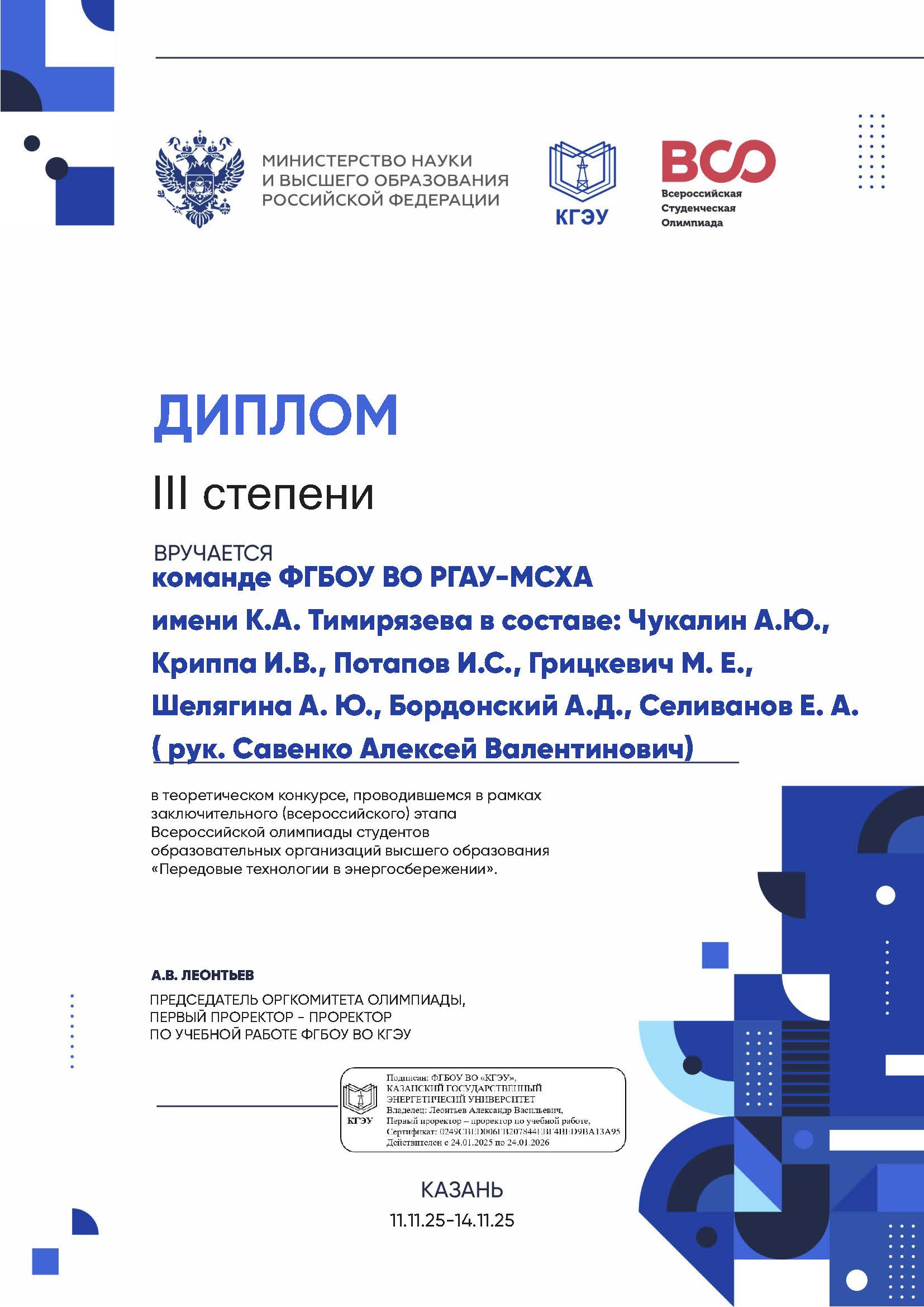 Сборная команда ФГБОУ ВО Российский государственный аграрный университет-МСХА имени К.А. Тимирязева заняла 3 место в теоретическом конкурсе, а также 3 место в конкурсе практических заданий. Сборная состояла из студентов 4-го курса Института механики и энергетики имени В.П. Горячкина: Чукалин А.Ю., Криппа И.В., Потапов И.С., Грицкевич М.Е., Шелягина А.Ю., Бордонский А.Д., Селиванов Е.А. руководитель к.т.н., доцент кафедры электроснабжения и теплоэнергетики имени академика И.А. Будзко Савенко А.В.