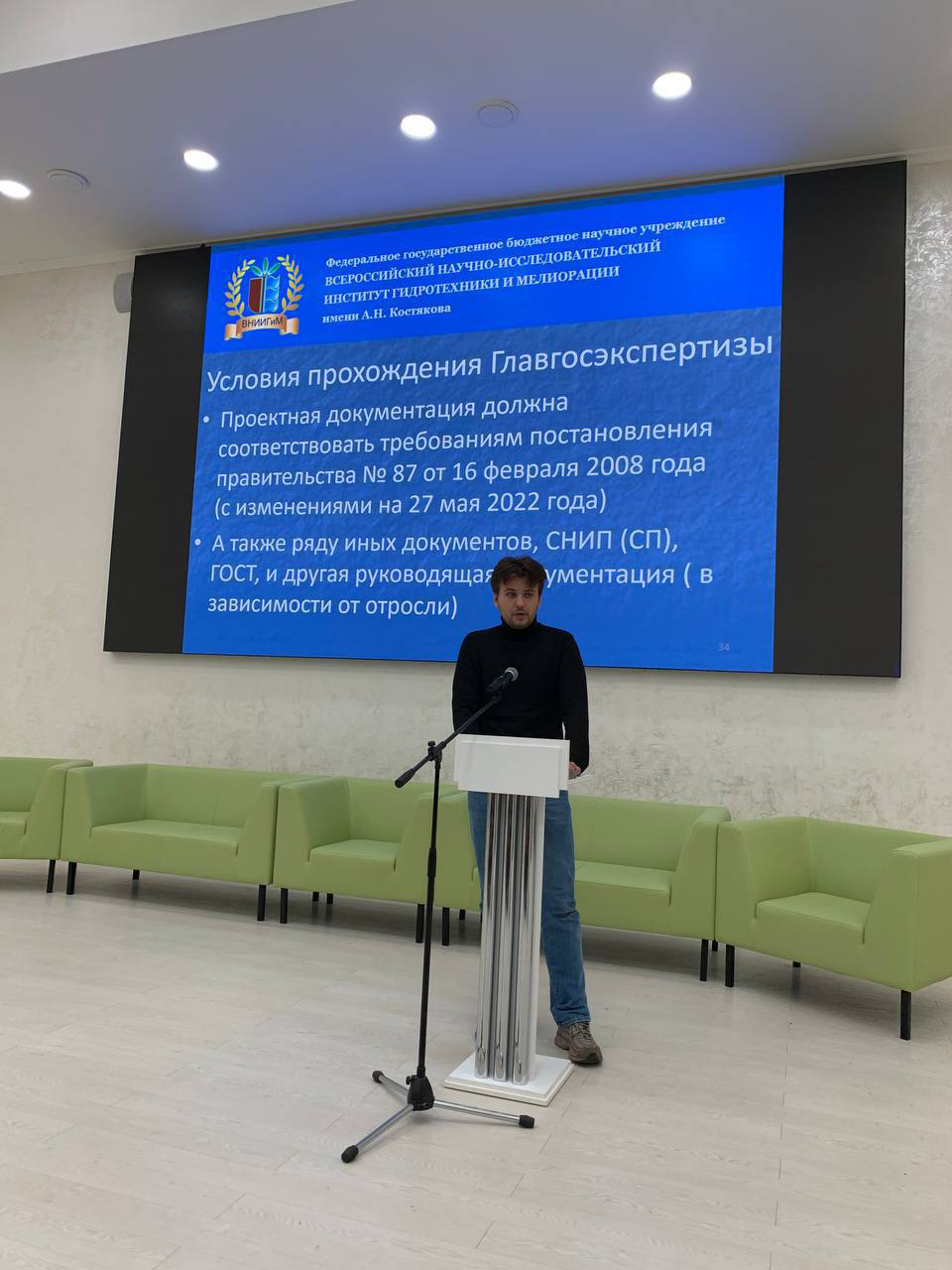 Кульчев Андрей Юрьевич, младший научный сотрудник, познакомил слушателей с основными партнерами института, которые являются ведущими российскими компаниями в области АПК. Рассказал о стандартизации в области мелиорации, подчеркнул важность данной деятельности, представил студентам реальные кейсы, с которыми им предстоит столкнуться в будущем.