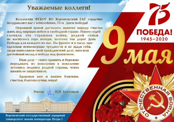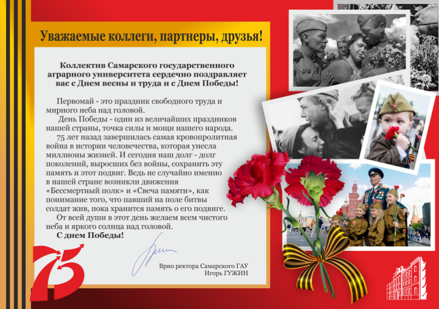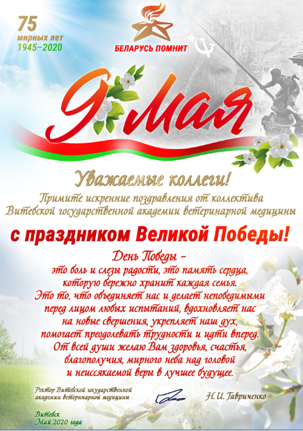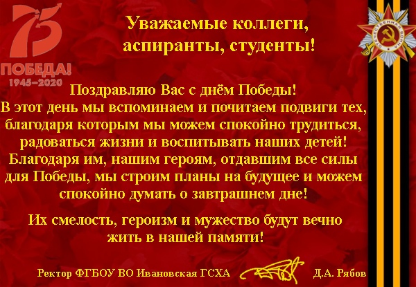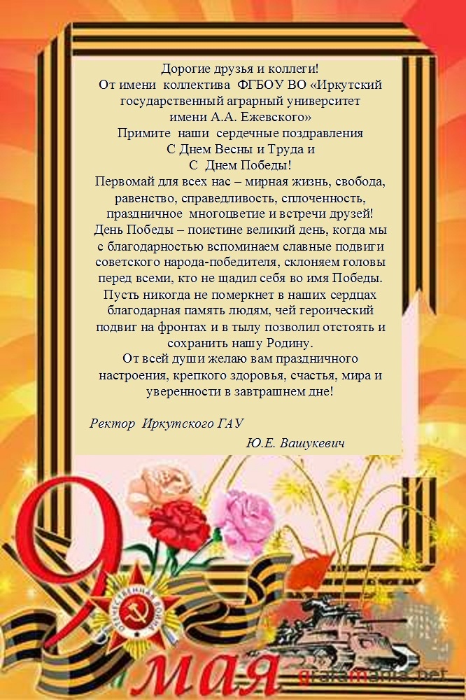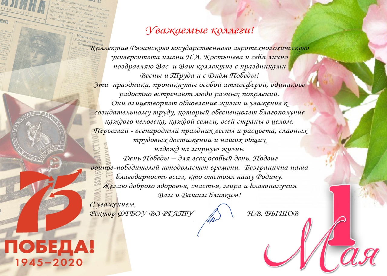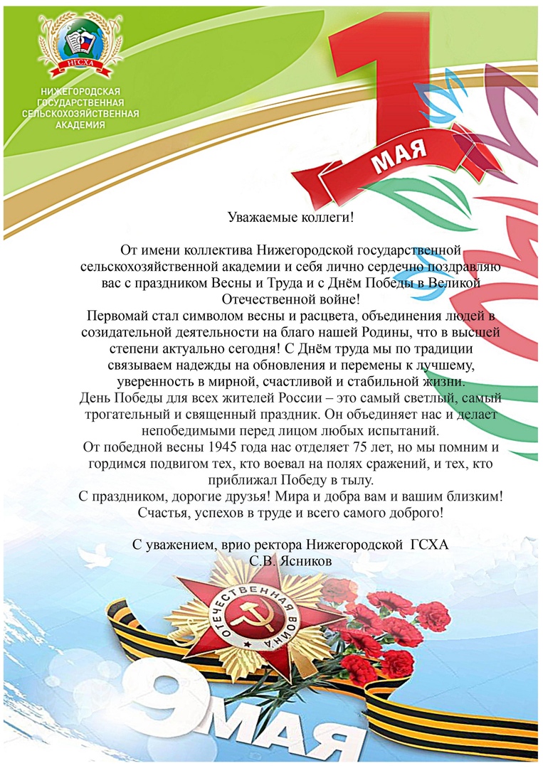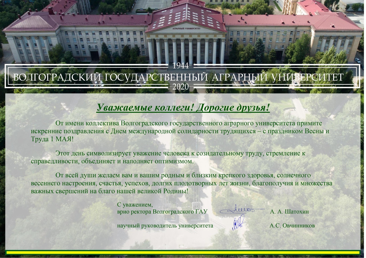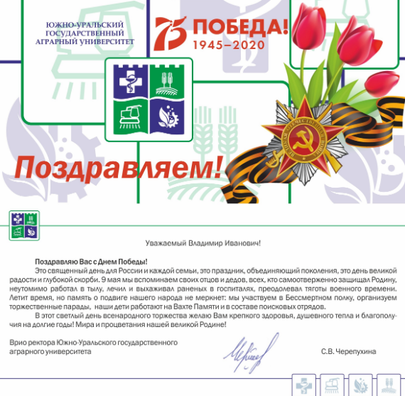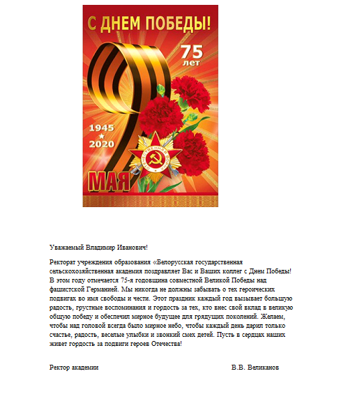 Добрые пожелания, приуроченные к 1 мая и Дню Победы, направили руководители и коллективы аграрных вузов: Монгольского ГАУ, Белорусской ГСХА, Витебской ГАВМ, Ташкентского института инженеров ирригации и механизации сельского хозяйства, Ставропольского ГАУ, Южно-Уральского ГАУ, Саратовского ГАУ, Воронежского ГАУ, Самарского ГАУ, Дальневосточного ГАУ, Мичуринского ГАУ, Донского ГАУ, Алтайского ГАУ, Волгоградского ГАУ, Уральского ГАУ, Чувашского ГАУ, Брянского ГАУ, Дагестанского ГАУ, Пензенского ГАУ, Иркутского ГАУ, Орловского ГАУ, Новосибирского ГАУ, Белгородского ГАУ, Рязанского ГАТУ, Санкт-Петербургского ГУВМ, Вятской ГСХА, Великолукской ГСХА, Ивановской ГСХА, Бурятской ГСХА, Нижегородской ГСХА, Азово-Черноморского инженерного института ФГБОУ ВО Донской ГАУ, а также Сергиево-Посадского аграрного колледжа.