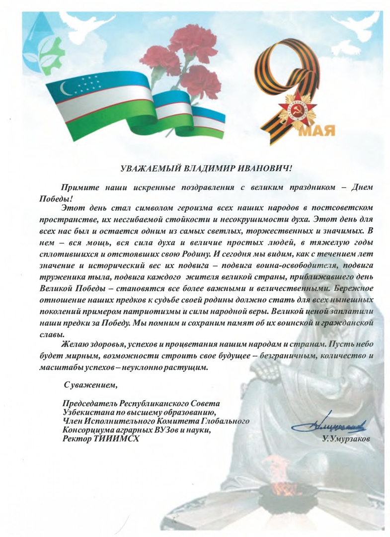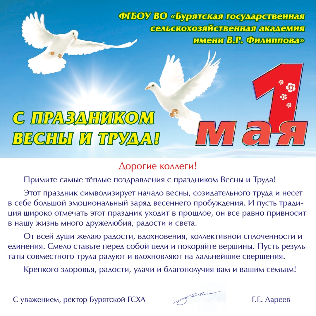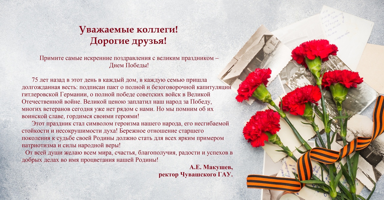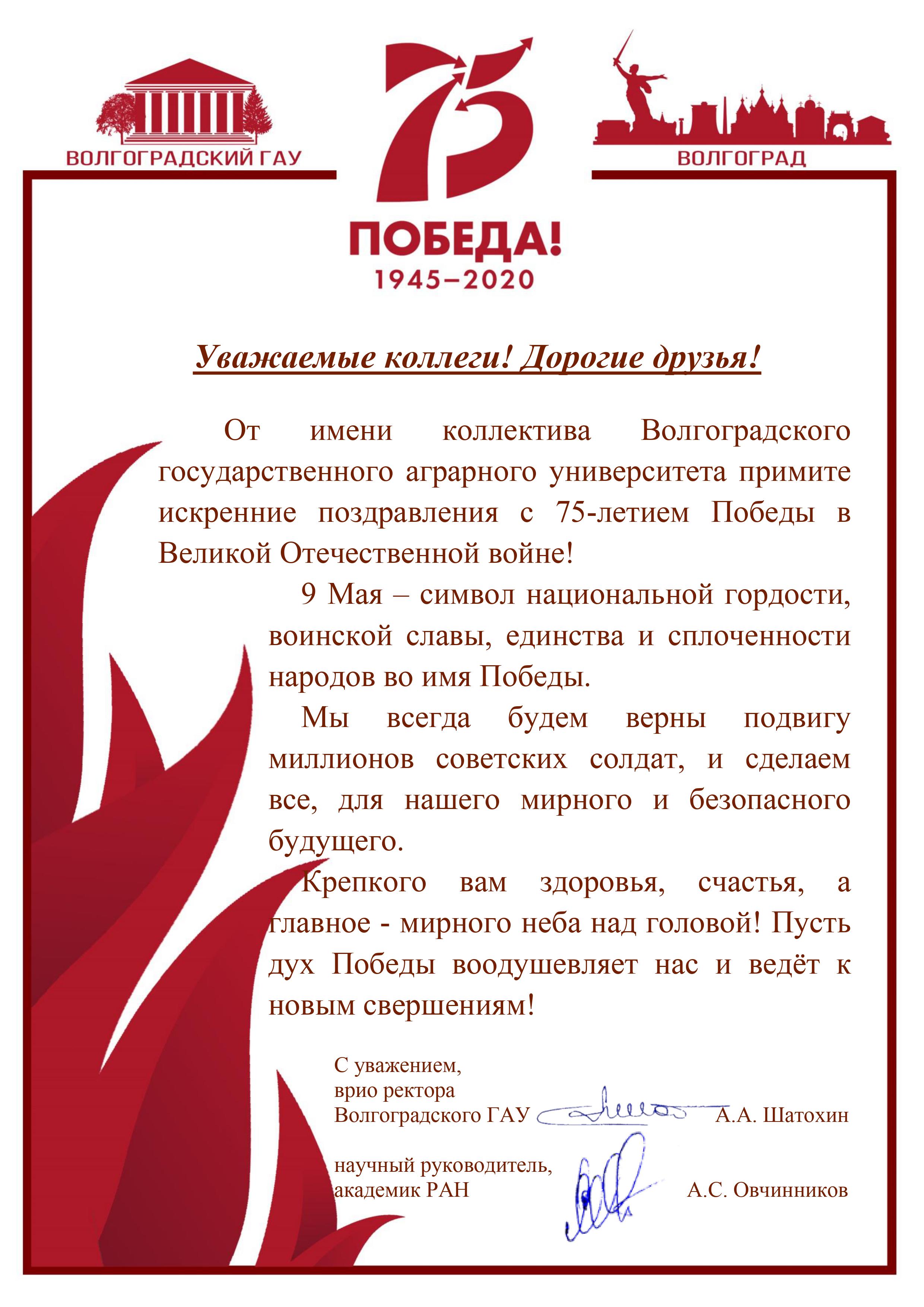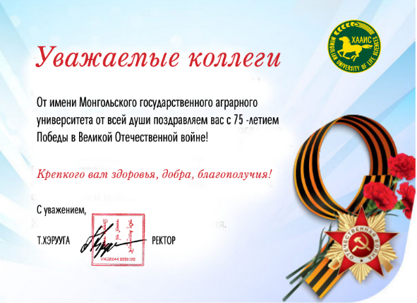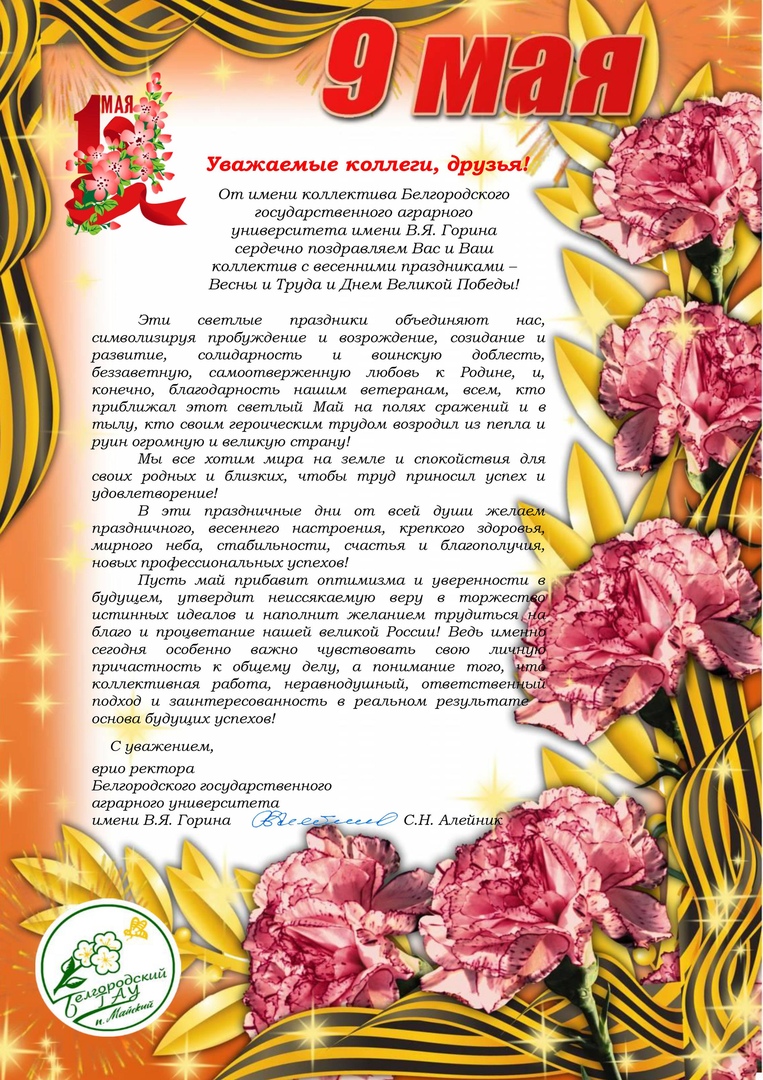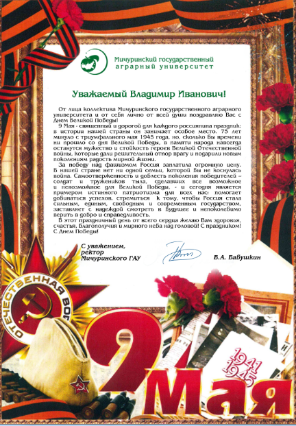 Добрые пожелания, приуроченные к 1 мая и Дню Победы, направили руководители и коллективы аграрных вузов: Монгольского ГАУ, Белорусской ГСХА, Витебской ГАВМ, Ташкентского института инженеров ирригации и механизации сельского хозяйства, Ставропольского ГАУ, Южно-Уральского ГАУ, Саратовского ГАУ, Воронежского ГАУ, Самарского ГАУ, Дальневосточного ГАУ, Мичуринского ГАУ, Донского ГАУ, Алтайского ГАУ, Волгоградского ГАУ, Уральского ГАУ, Чувашского ГАУ, Брянского ГАУ, Дагестанского ГАУ, Пензенского ГАУ, Иркутского ГАУ, Орловского ГАУ, Новосибирского ГАУ, Белгородского ГАУ, Рязанского ГАТУ, Санкт-Петербургского ГУВМ, Вятской ГСХА, Великолукской ГСХА, Ивановской ГСХА, Бурятской ГСХА, Нижегородской ГСХА, Азово-Черноморского инженерного института ФГБОУ ВО Донской ГАУ, а также Сергиево-Посадского аграрного колледжа.