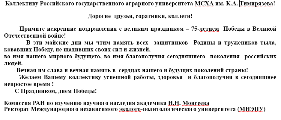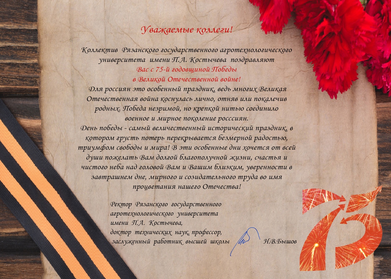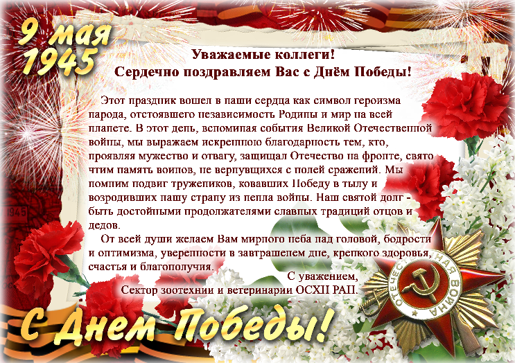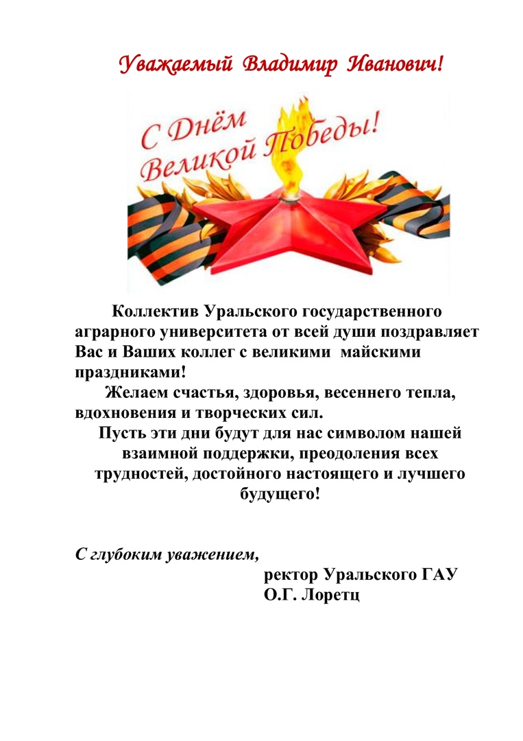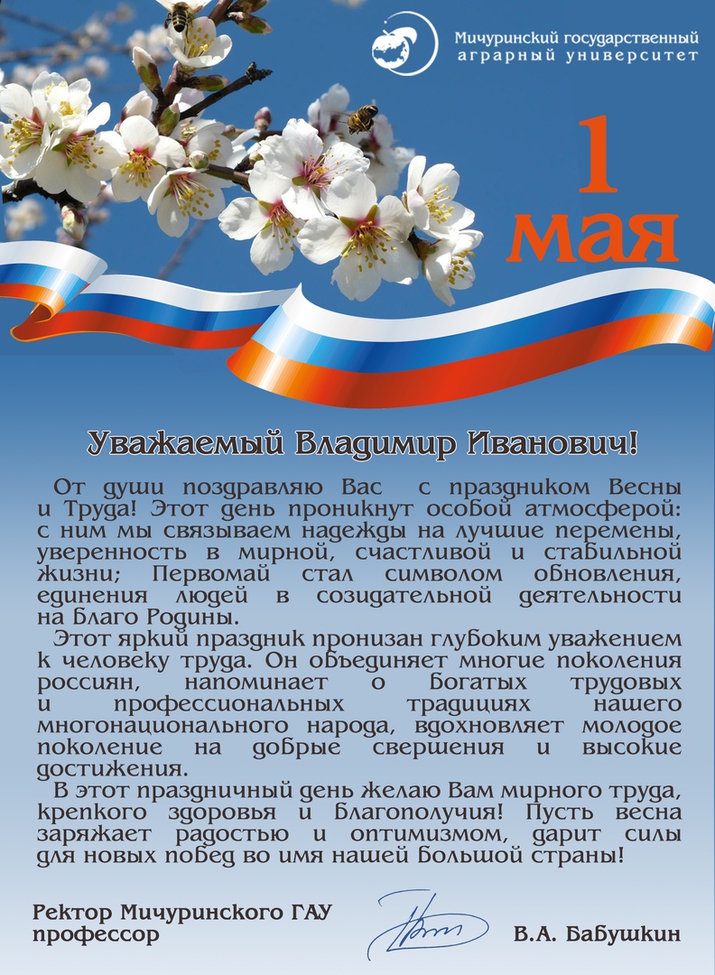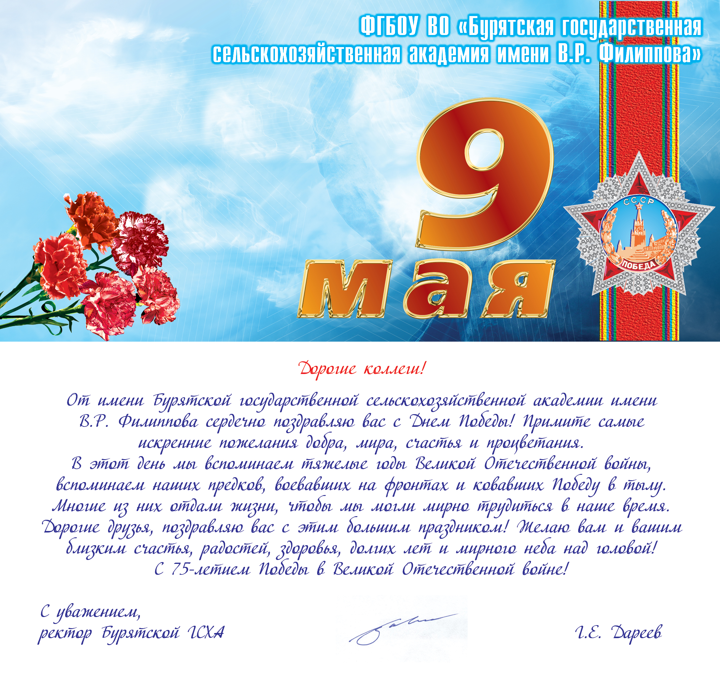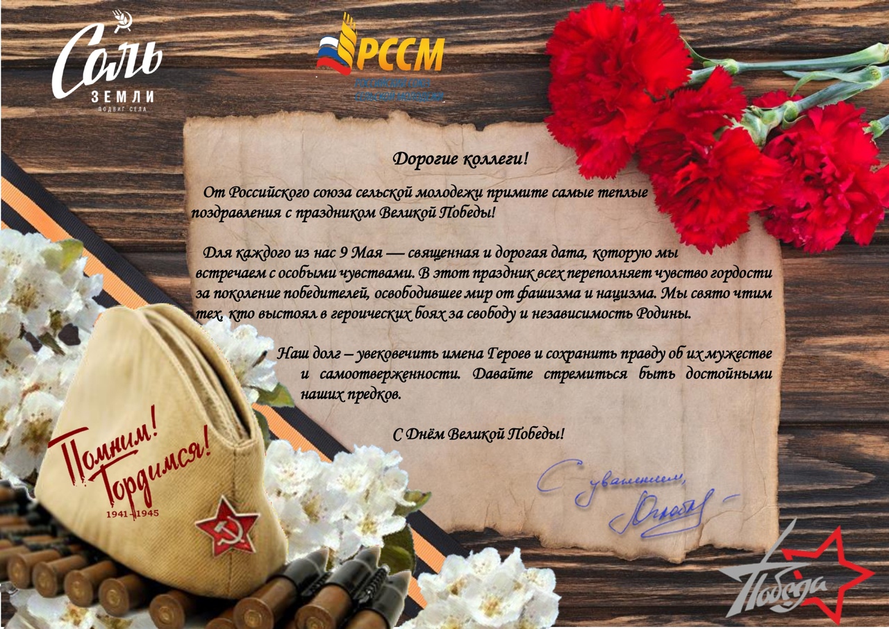 Добрые пожелания, приуроченные к 1 мая и Дню Победы, направили руководители и коллективы аграрных вузов: Монгольского ГАУ, Белорусской ГСХА, Витебской ГАВМ, Ташкентского института инженеров ирригации и механизации сельского хозяйства, Ставропольского ГАУ, Южно-Уральского ГАУ, Саратовского ГАУ, Воронежского ГАУ, Самарского ГАУ, Дальневосточного ГАУ, Мичуринского ГАУ, Донского ГАУ, Алтайского ГАУ, Волгоградского ГАУ, Уральского ГАУ, Чувашского ГАУ, Брянского ГАУ, Дагестанского ГАУ, Пензенского ГАУ, Иркутского ГАУ, Орловского ГАУ, Новосибирского ГАУ, Белгородского ГАУ, Рязанского ГАТУ, Санкт-Петербургского ГУВМ, Вятской ГСХА, Великолукской ГСХА, Ивановской ГСХА, Бурятской ГСХА, Нижегородской ГСХА, Азово-Черноморского инженерного института ФГБОУ ВО Донской ГАУ, а также Сергиево-Посадского аграрного колледжа.