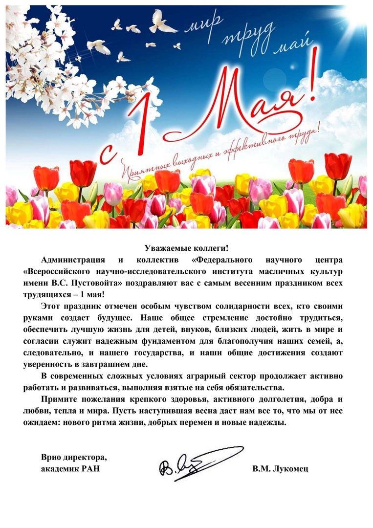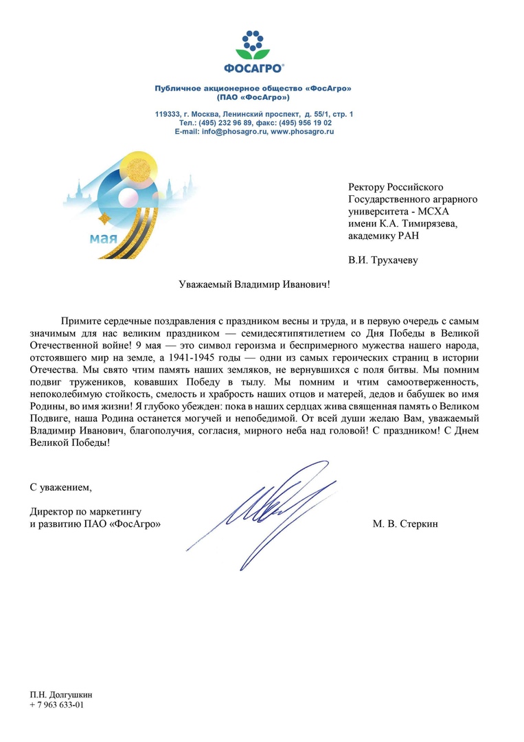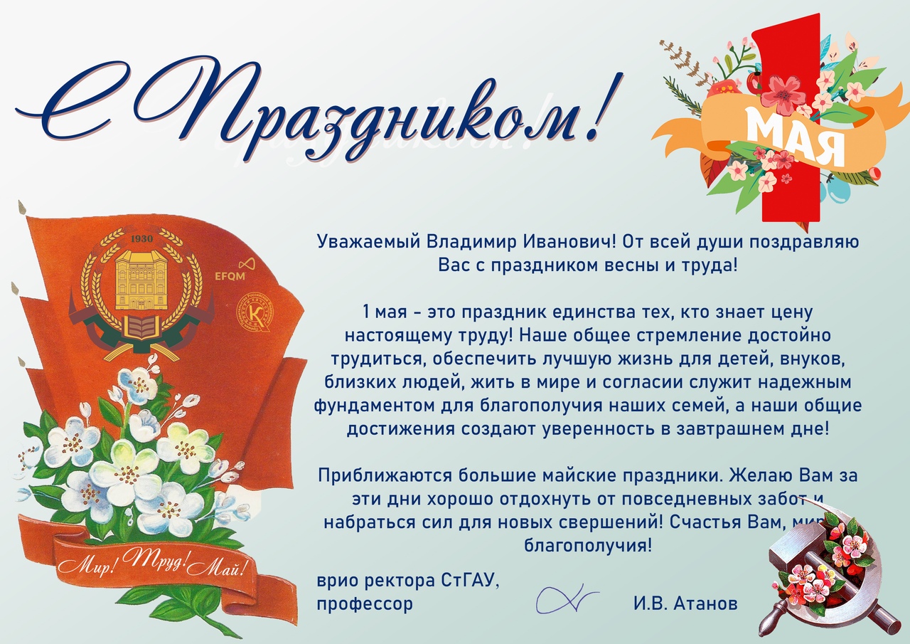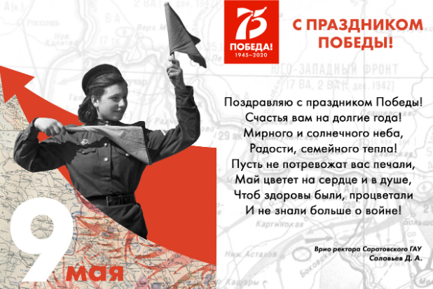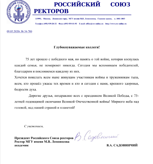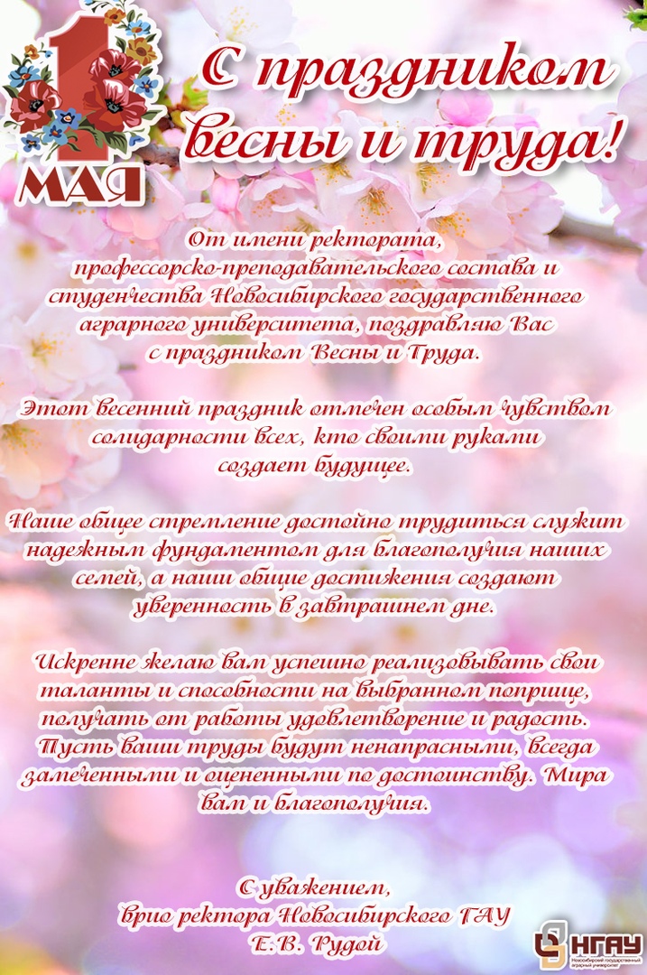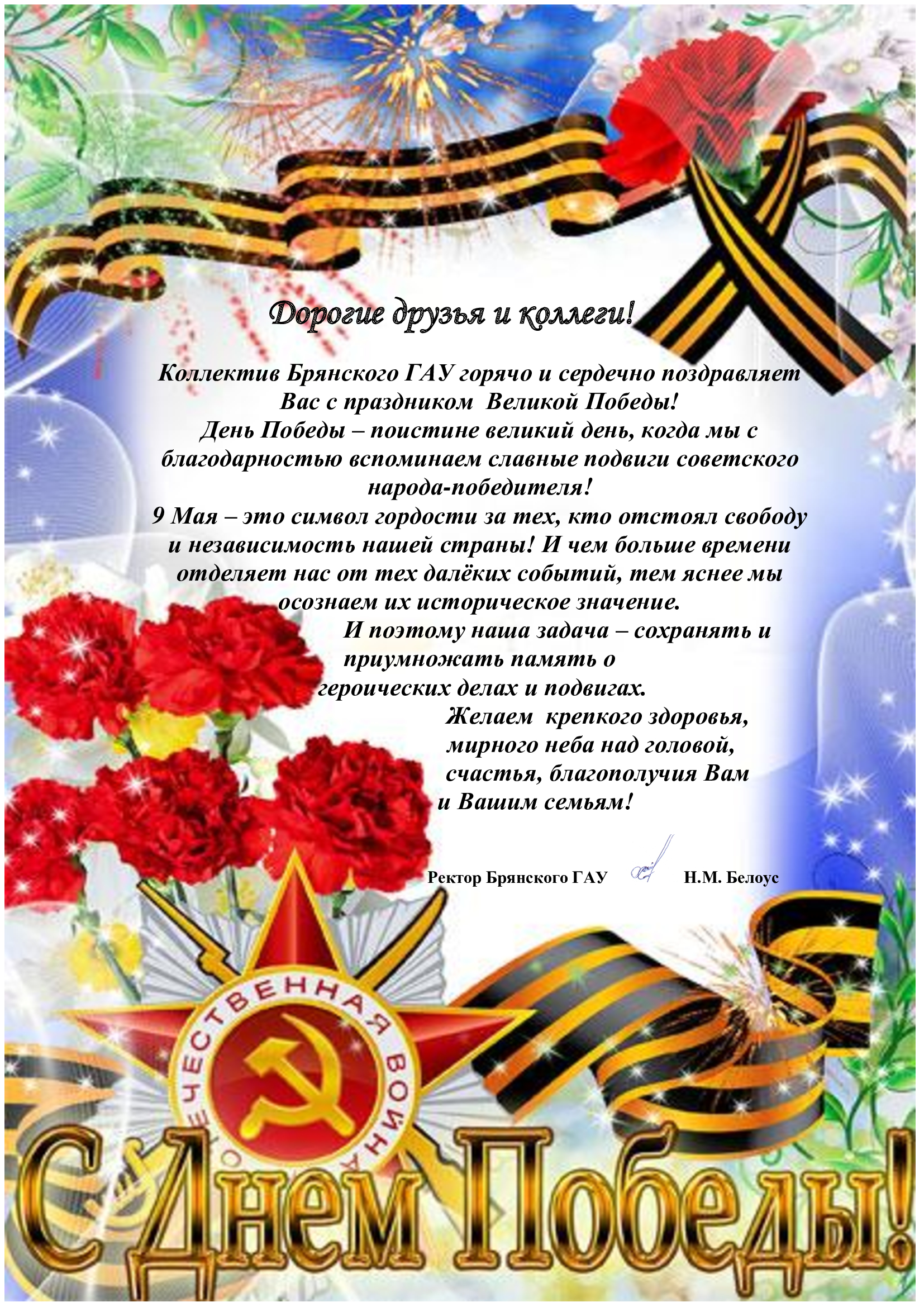 Добрые пожелания, приуроченные к 1 мая и Дню Победы, направили руководители и коллективы аграрных вузов: Монгольского ГАУ, Белорусской ГСХА, Витебской ГАВМ, Ташкентского института инженеров ирригации и механизации сельского хозяйства, Ставропольского ГАУ, Южно-Уральского ГАУ, Саратовского ГАУ, Воронежского ГАУ, Самарского ГАУ, Дальневосточного ГАУ, Мичуринского ГАУ, Донского ГАУ, Алтайского ГАУ, Волгоградского ГАУ, Уральского ГАУ, Чувашского ГАУ, Брянского ГАУ, Дагестанского ГАУ, Пензенского ГАУ, Иркутского ГАУ, Орловского ГАУ, Новосибирского ГАУ, Белгородского ГАУ, Рязанского ГАТУ, Санкт-Петербургского ГУВМ, Вятской ГСХА, Великолукской ГСХА, Ивановской ГСХА, Бурятской ГСХА, Нижегородской ГСХА, Азово-Черноморского инженерного института ФГБОУ ВО Донской ГАУ, а также Сергиево-Посадского аграрного колледжа.
