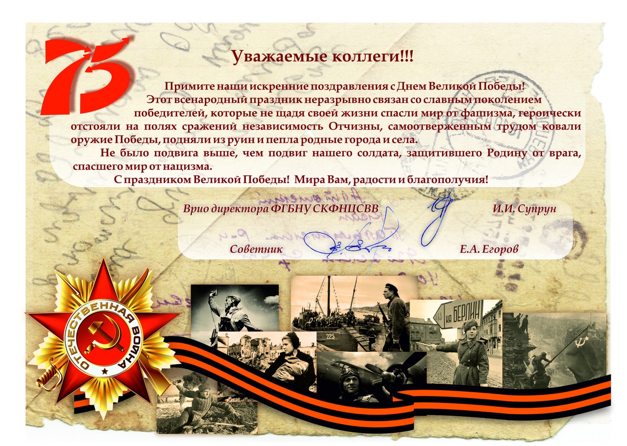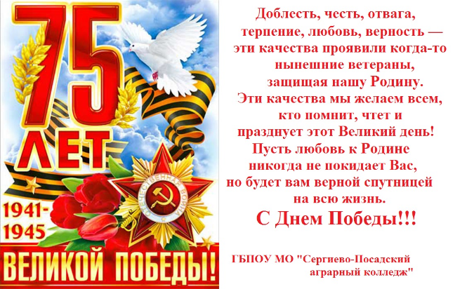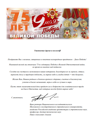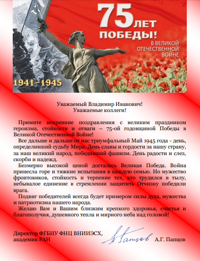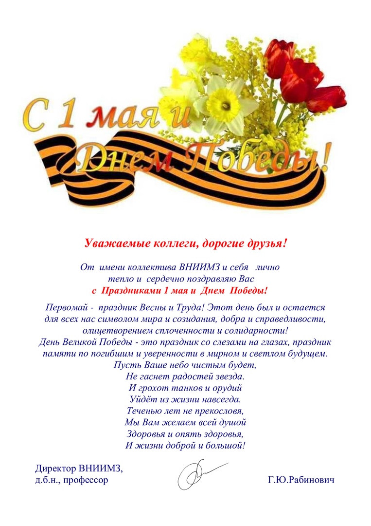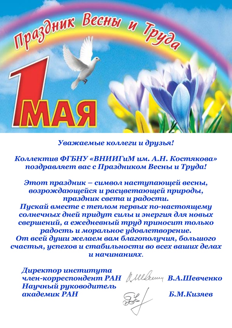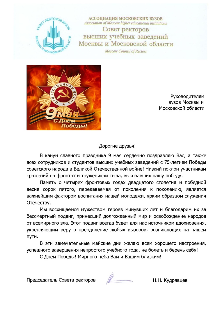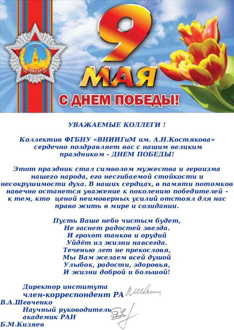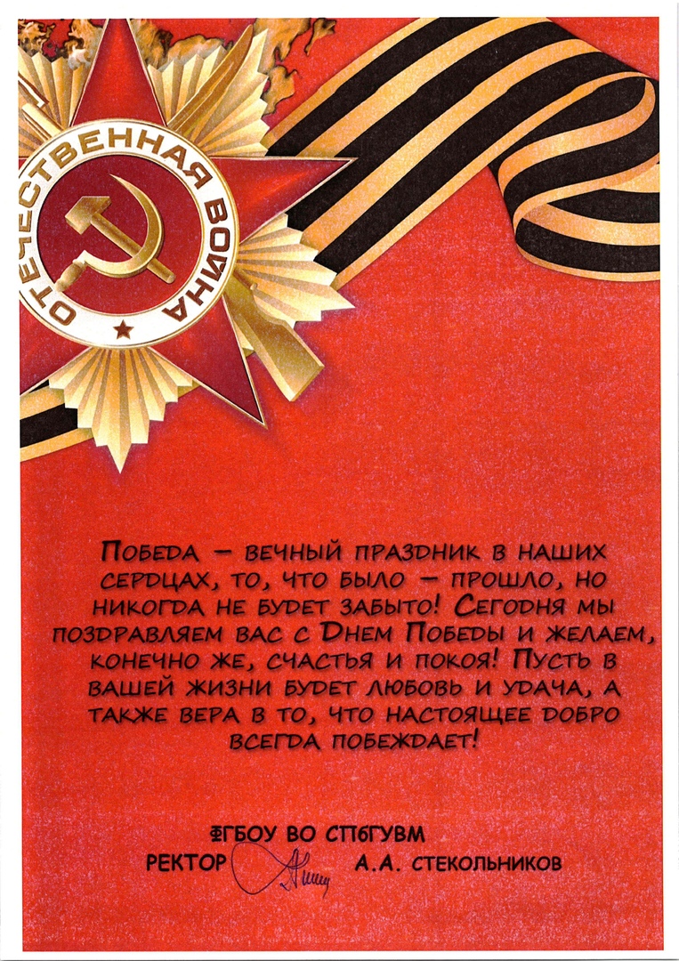 Добрые пожелания, приуроченные к 1 мая и Дню Победы, направили руководители и коллективы аграрных вузов: Монгольского ГАУ, Белорусской ГСХА, Витебской ГАВМ, Ташкентского института инженеров ирригации и механизации сельского хозяйства, Ставропольского ГАУ, Южно-Уральского ГАУ, Саратовского ГАУ, Воронежского ГАУ, Самарского ГАУ, Дальневосточного ГАУ, Мичуринского ГАУ, Донского ГАУ, Алтайского ГАУ, Волгоградского ГАУ, Уральского ГАУ, Чувашского ГАУ, Брянского ГАУ, Дагестанского ГАУ, Пензенского ГАУ, Иркутского ГАУ, Орловского ГАУ, Новосибирского ГАУ, Белгородского ГАУ, Рязанского ГАТУ, Санкт-Петербургского ГУВМ, Вятской ГСХА, Великолукской ГСХА, Ивановской ГСХА, Бурятской ГСХА, Нижегородской ГСХА, Азово-Черноморского инженерного института ФГБОУ ВО Донской ГАУ, а также Сергиево-Посадского аграрного колледжа.
