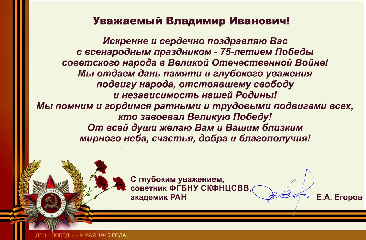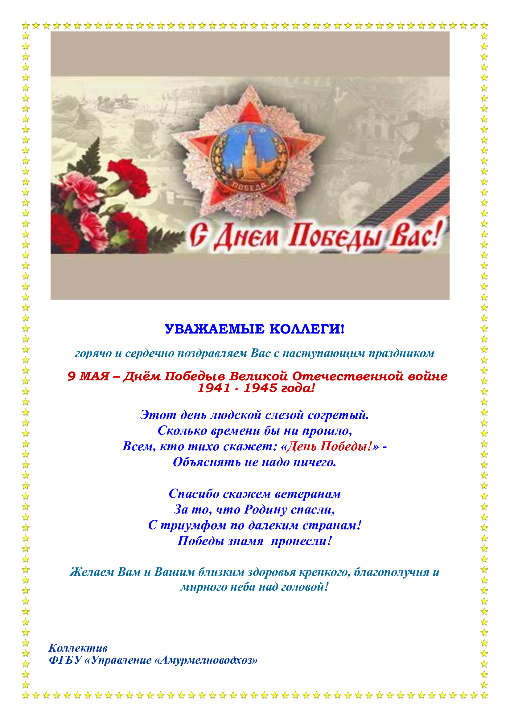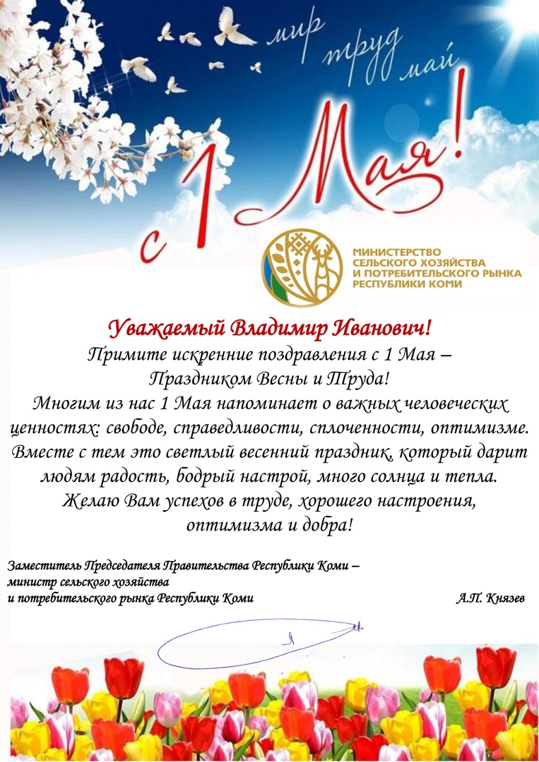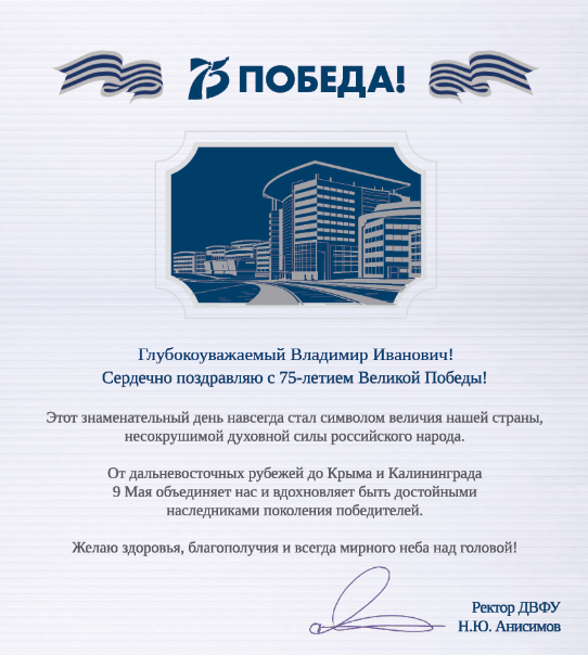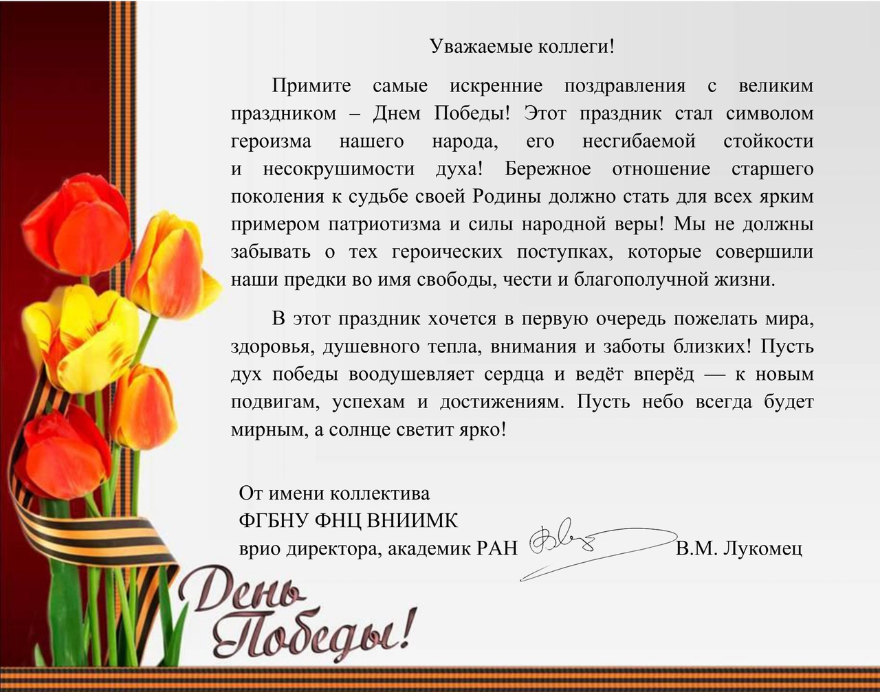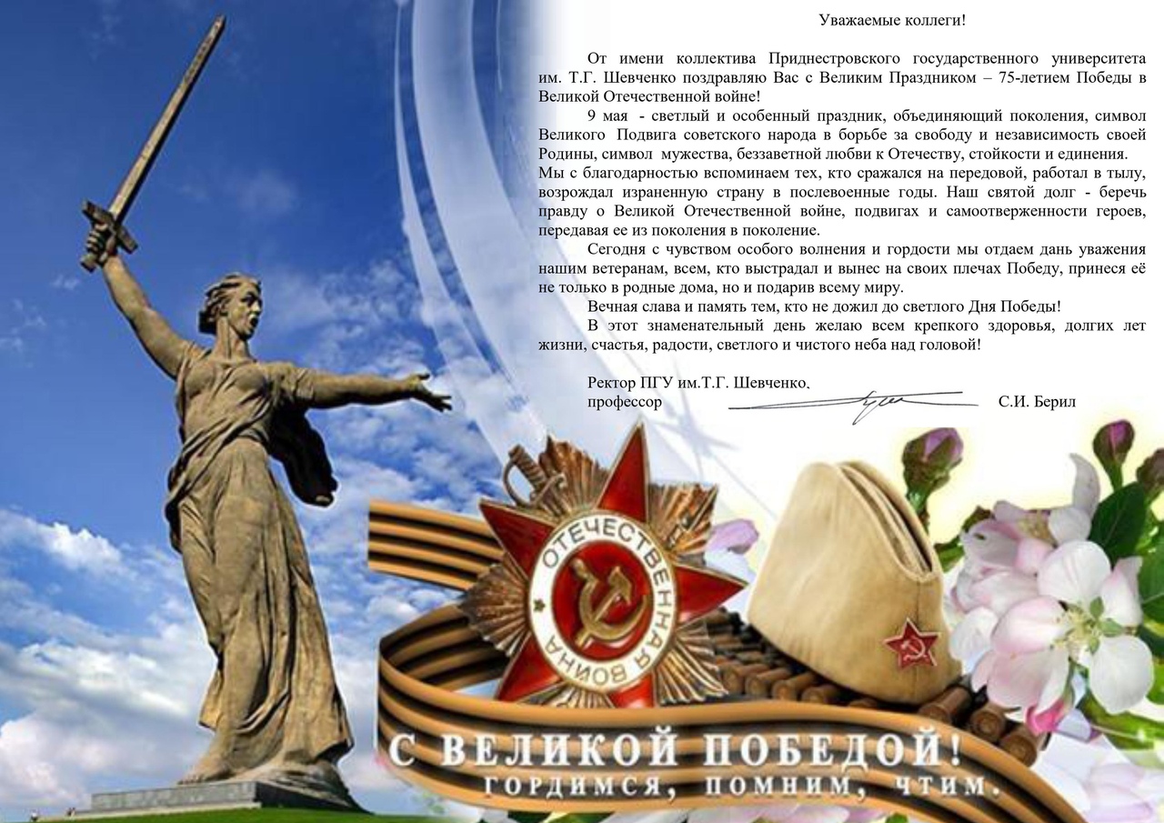 Добрые пожелания, приуроченные к 1 мая и Дню Победы, направили руководители и коллективы аграрных вузов: Монгольского ГАУ, Белорусской ГСХА, Витебской ГАВМ, Ташкентского института инженеров ирригации и механизации сельского хозяйства, Ставропольского ГАУ, Южно-Уральского ГАУ, Саратовского ГАУ, Воронежского ГАУ, Самарского ГАУ, Дальневосточного ГАУ, Мичуринского ГАУ, Донского ГАУ, Алтайского ГАУ, Волгоградского ГАУ, Уральского ГАУ, Чувашского ГАУ, Брянского ГАУ, Дагестанского ГАУ, Пензенского ГАУ, Иркутского ГАУ, Орловского ГАУ, Новосибирского ГАУ, Белгородского ГАУ, Рязанского ГАТУ, Санкт-Петербургского ГУВМ, Вятской ГСХА, Великолукской ГСХА, Ивановской ГСХА, Бурятской ГСХА, Нижегородской ГСХА, Азово-Черноморского инженерного института ФГБОУ ВО Донской ГАУ, а также Сергиево-Посадского аграрного колледжа.