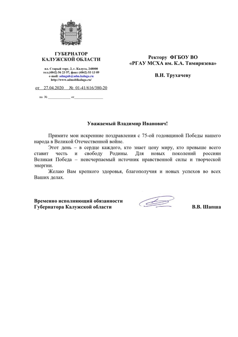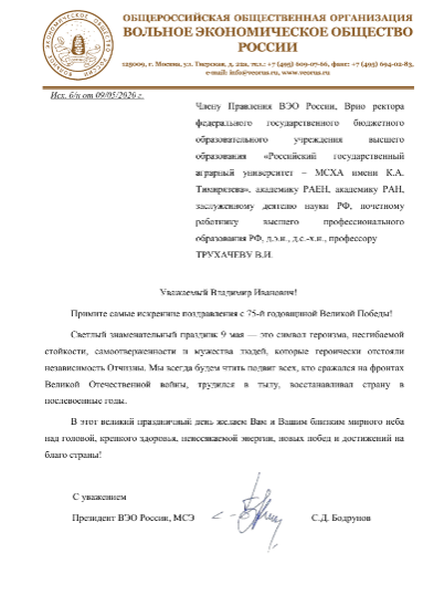 В адрес ректора, Академика РАН, профессора В.И. Трухачева и всего коллектива РГАУ-МСХА имени К.А. Тимирязева поступили многочисленные поздравления от вузов-партнеров, отраслевых структур, государственных и общественных организаций, руководителей федеральных и региональных органов исполнительной власти.