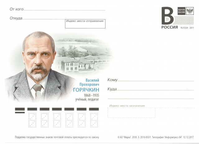 К 150-летнему юбилею основоположника земледельческой механики Василия Прохоровича Горячкина Федеральным агентством связи выпущено 5000 экземпляров почтовых открыток с портретом академика и изображением построенной благодаря его усилиям машиноиспытательной станции.