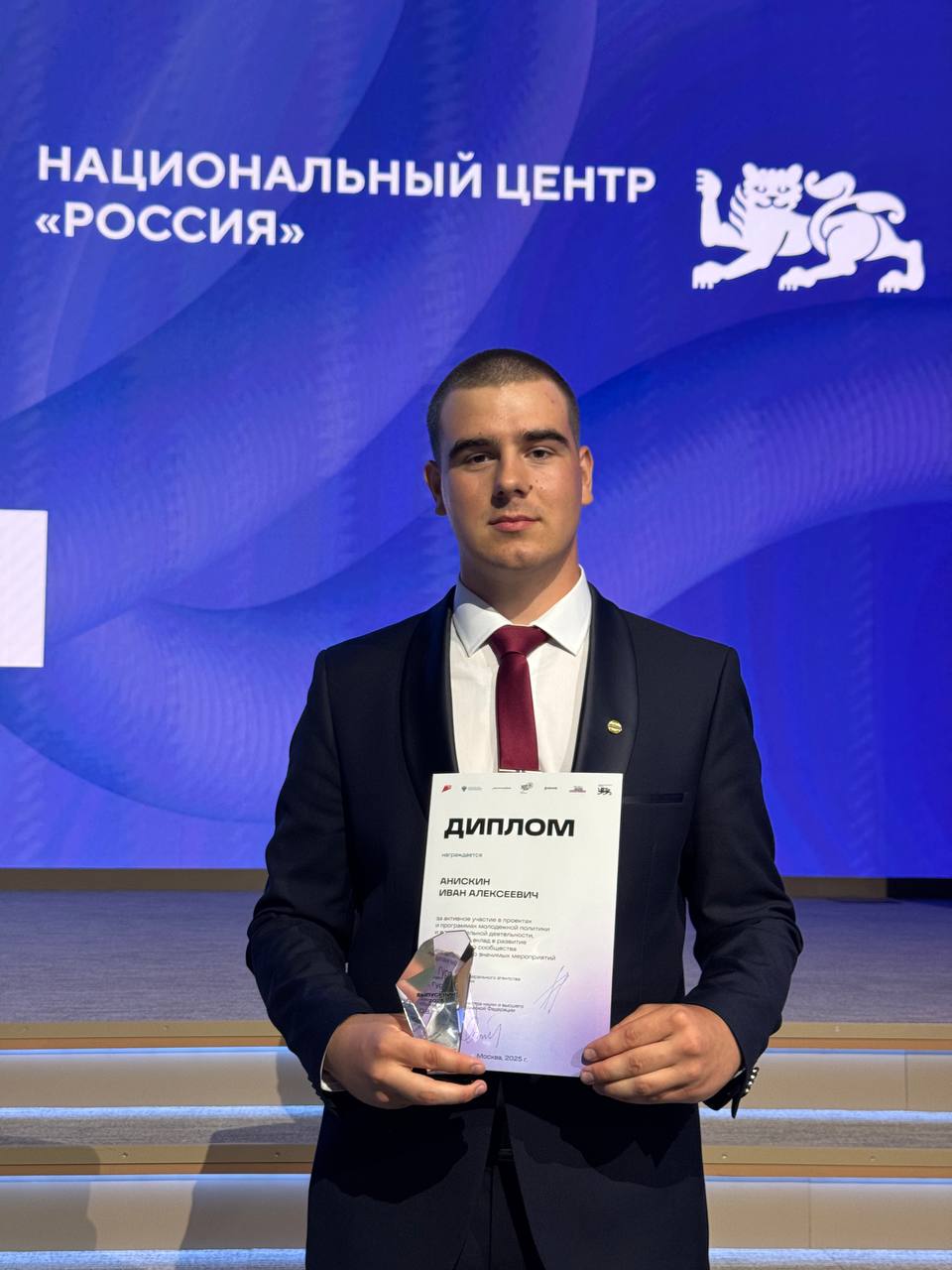 В торжественной обстановке на главной сцене Национального центра «Россия» были отмечены 26 выдающихся выпускников, окончивших вузы с абсолютным отличием и достигших высоких результатов в научной, общественной, творческой, спортивной и медиа-сфере, а также те, кто за время обучения создал семью и вместе развивал социально-важные проекты. Среди них был и наш выпускник Иван Анискин.