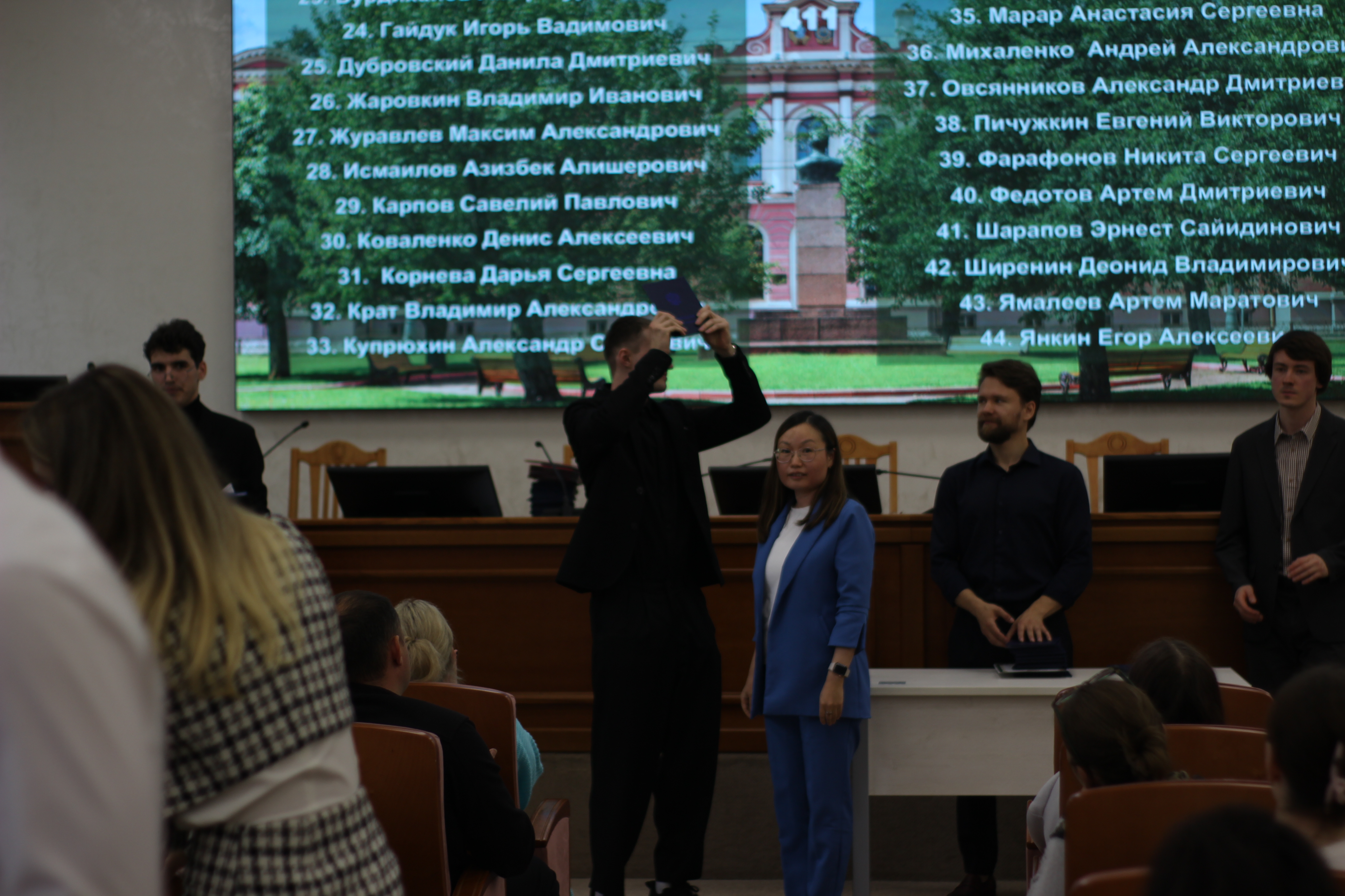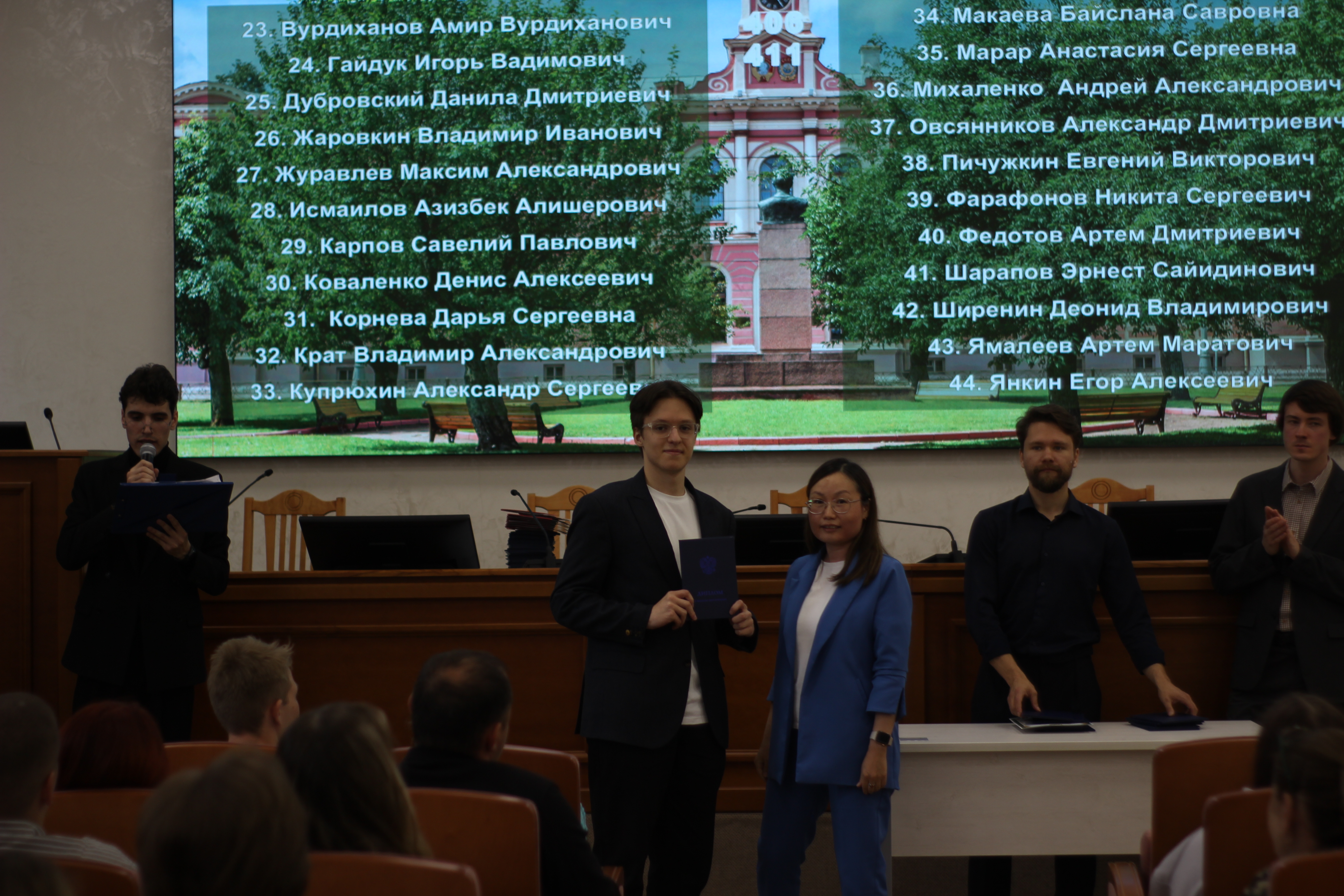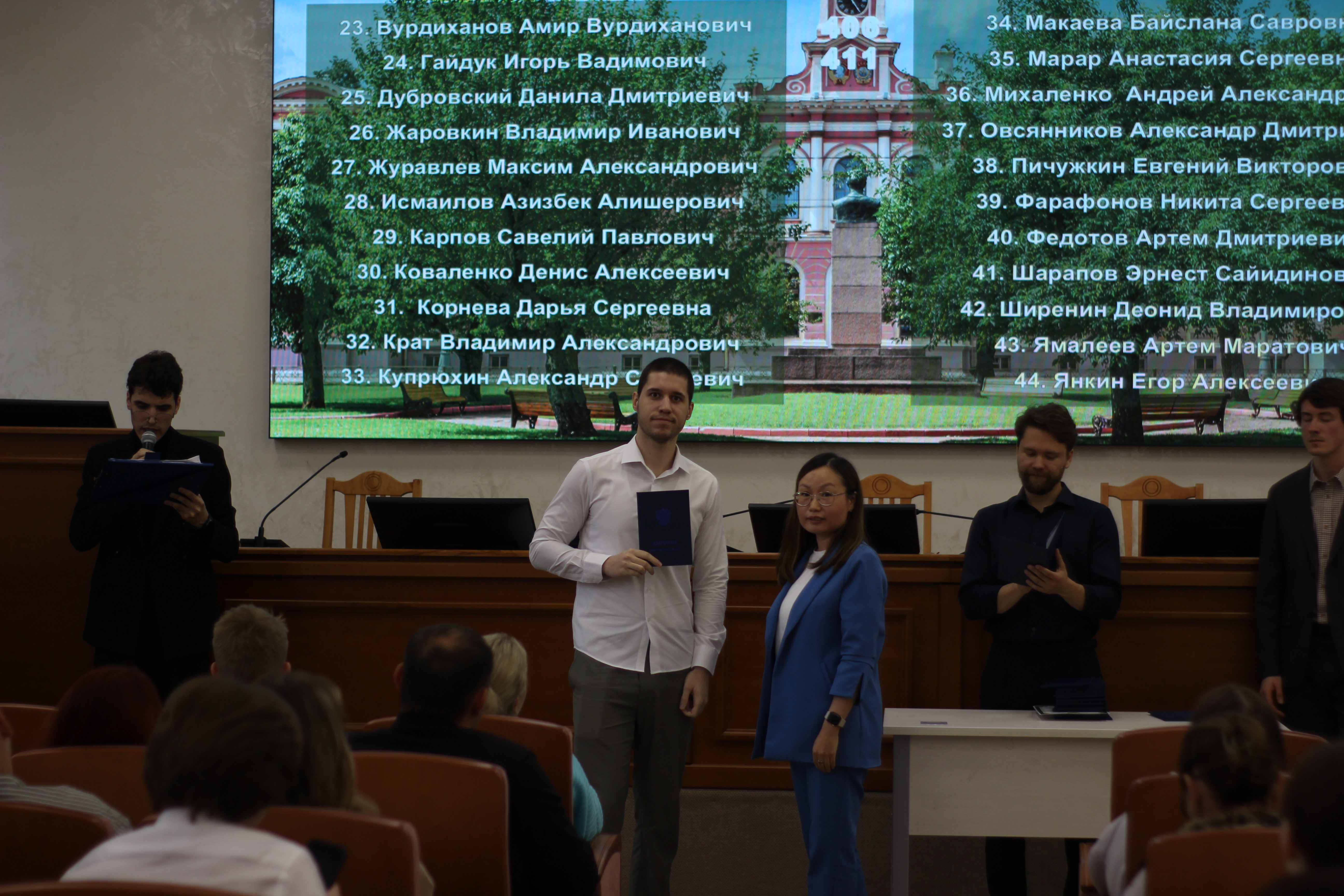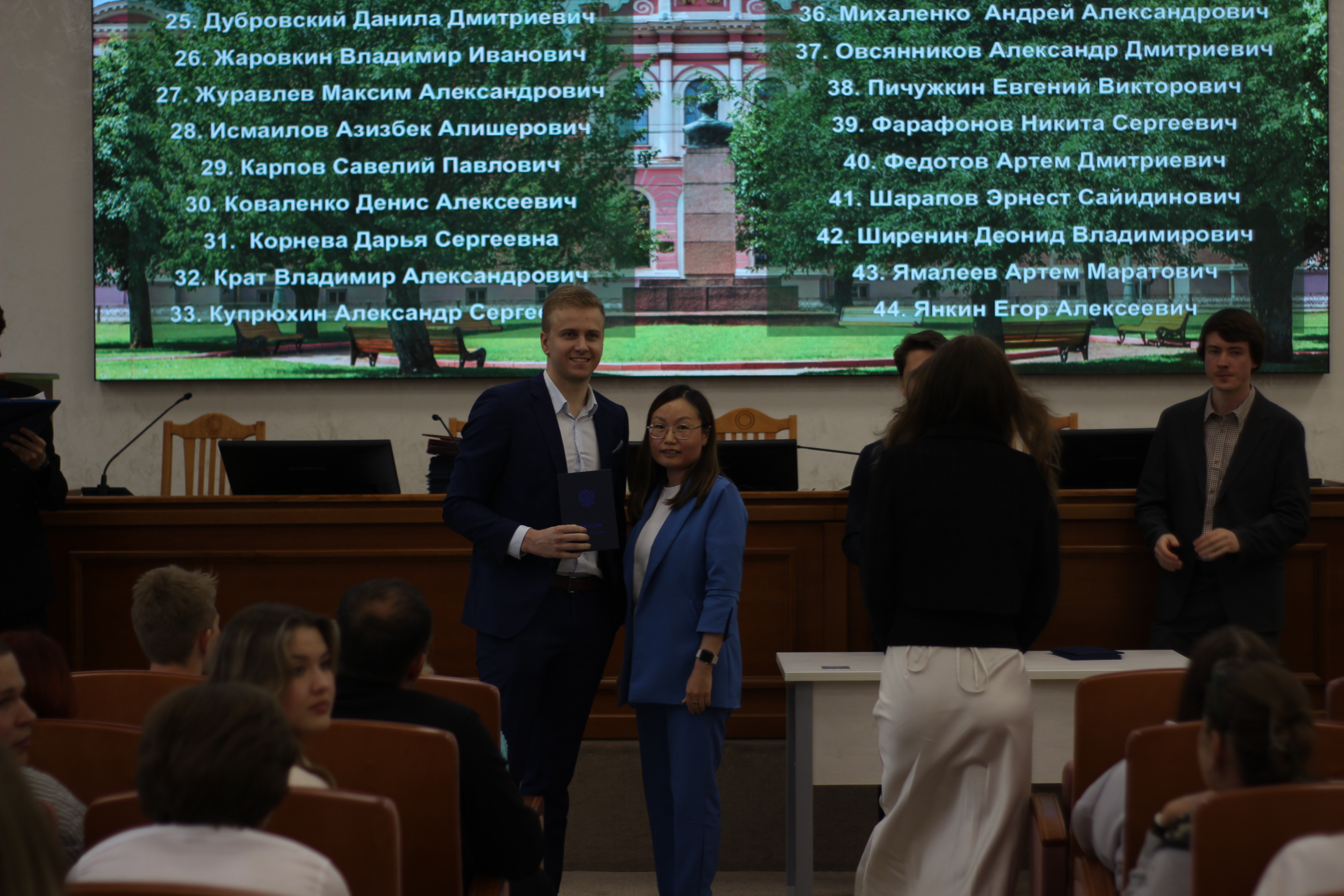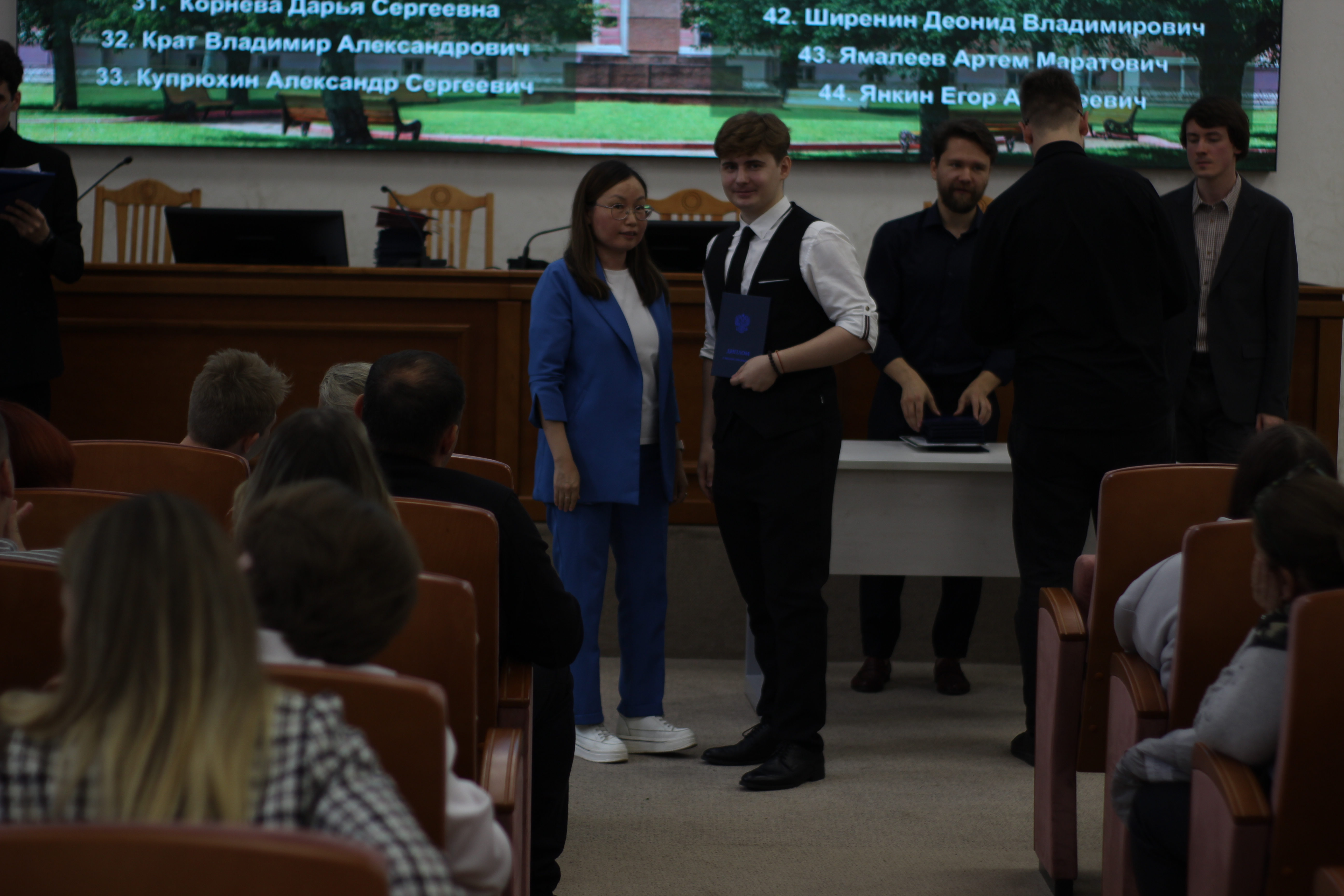 Вручение дипломов началось с поздравлений и пожеланий успехов заведующих кафедрами и кураторов учебных групп. Ведущими мероприятия выступили доцент кафедры статистики и кибернетики Дашиева Б.Ш., ассистенты кафедры статистики и кибернетики Ветошкин А.Ю. и Козлов К.А.