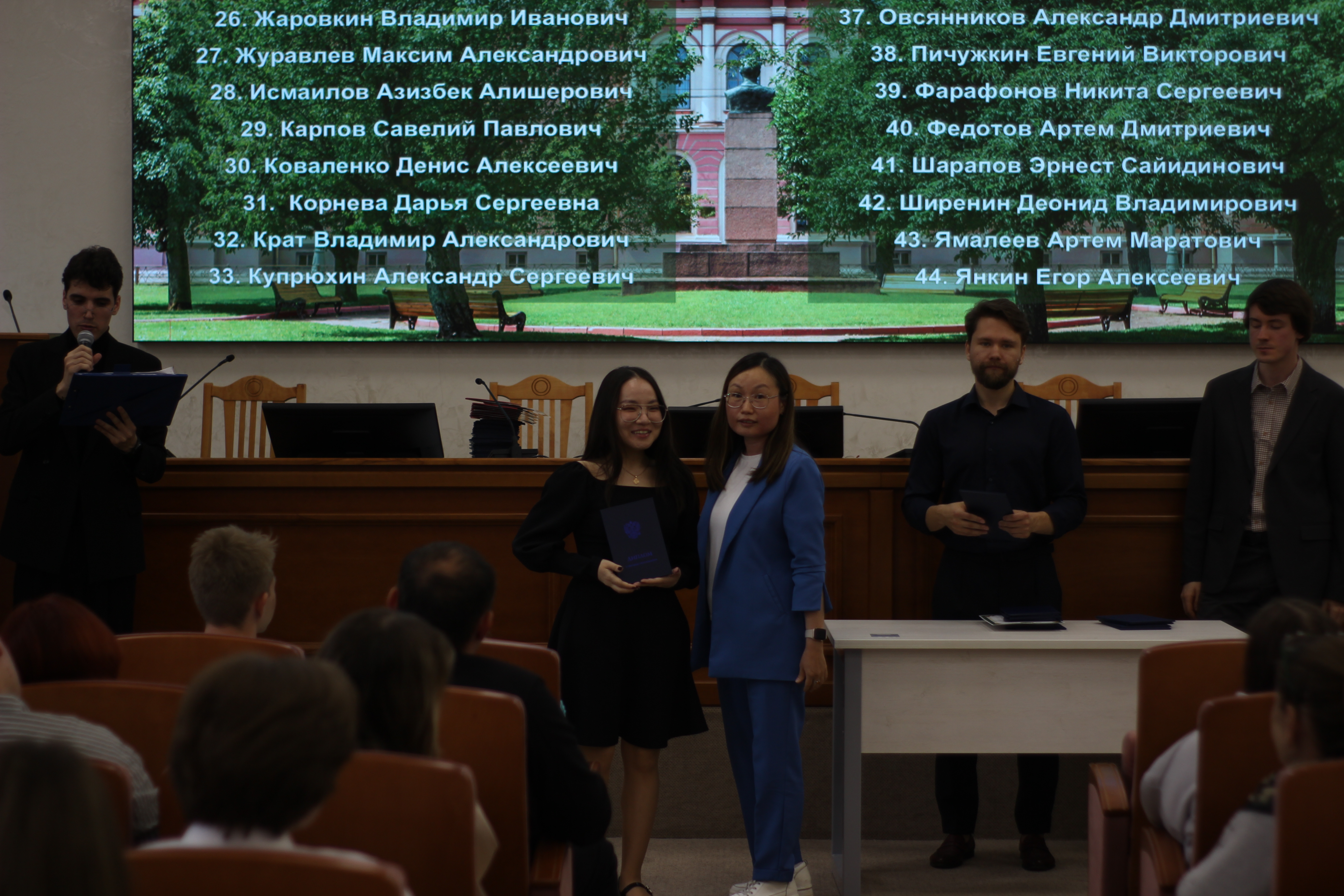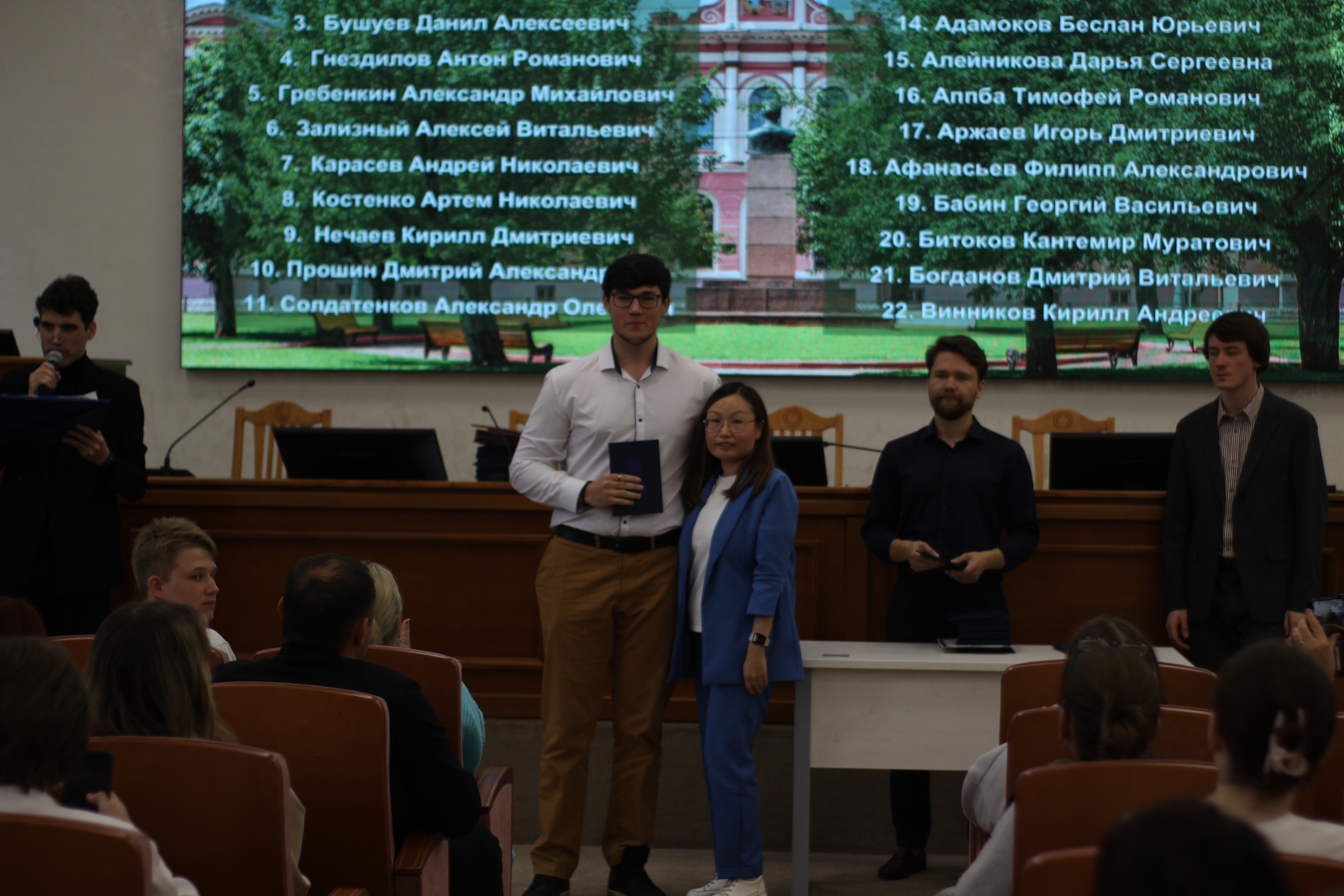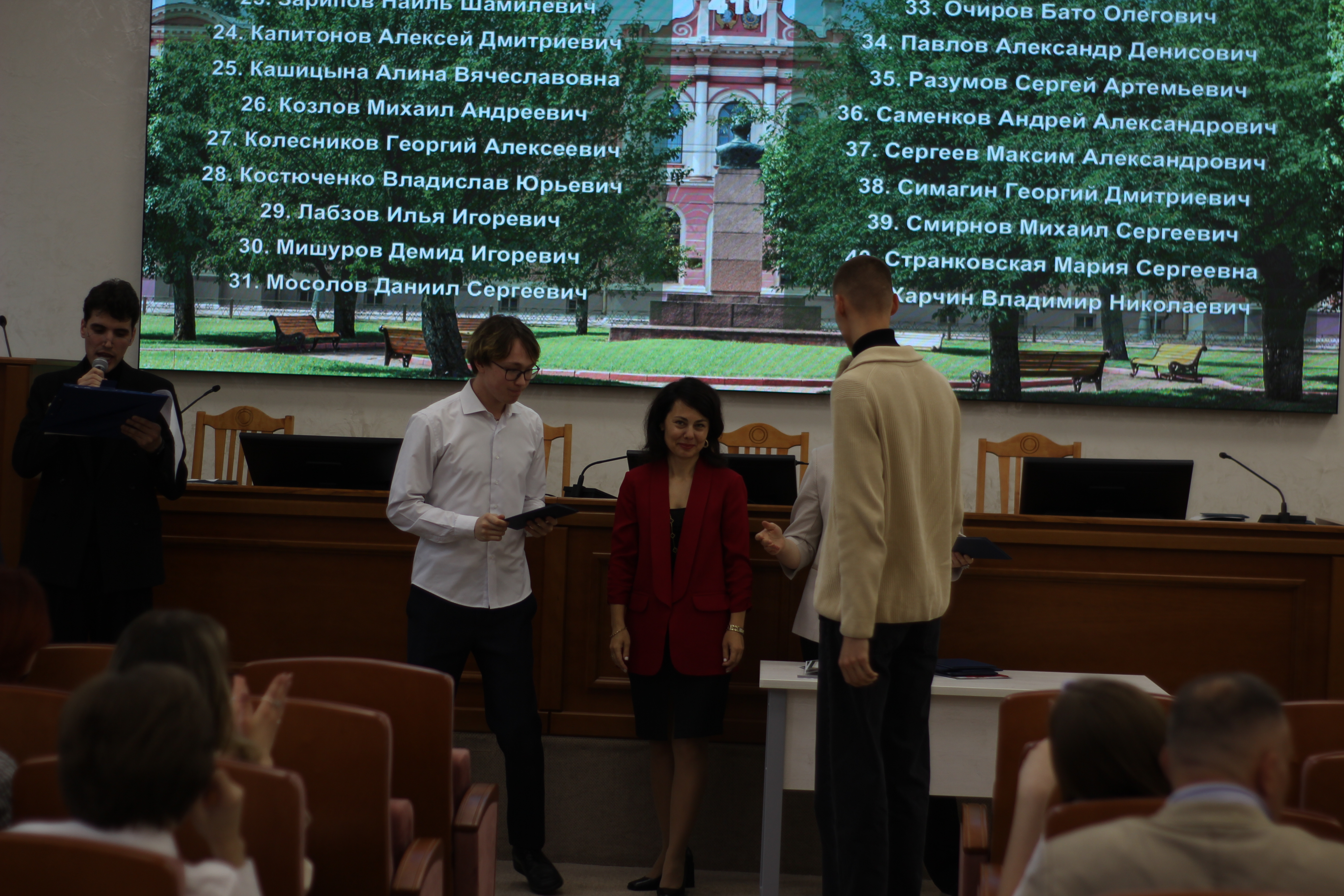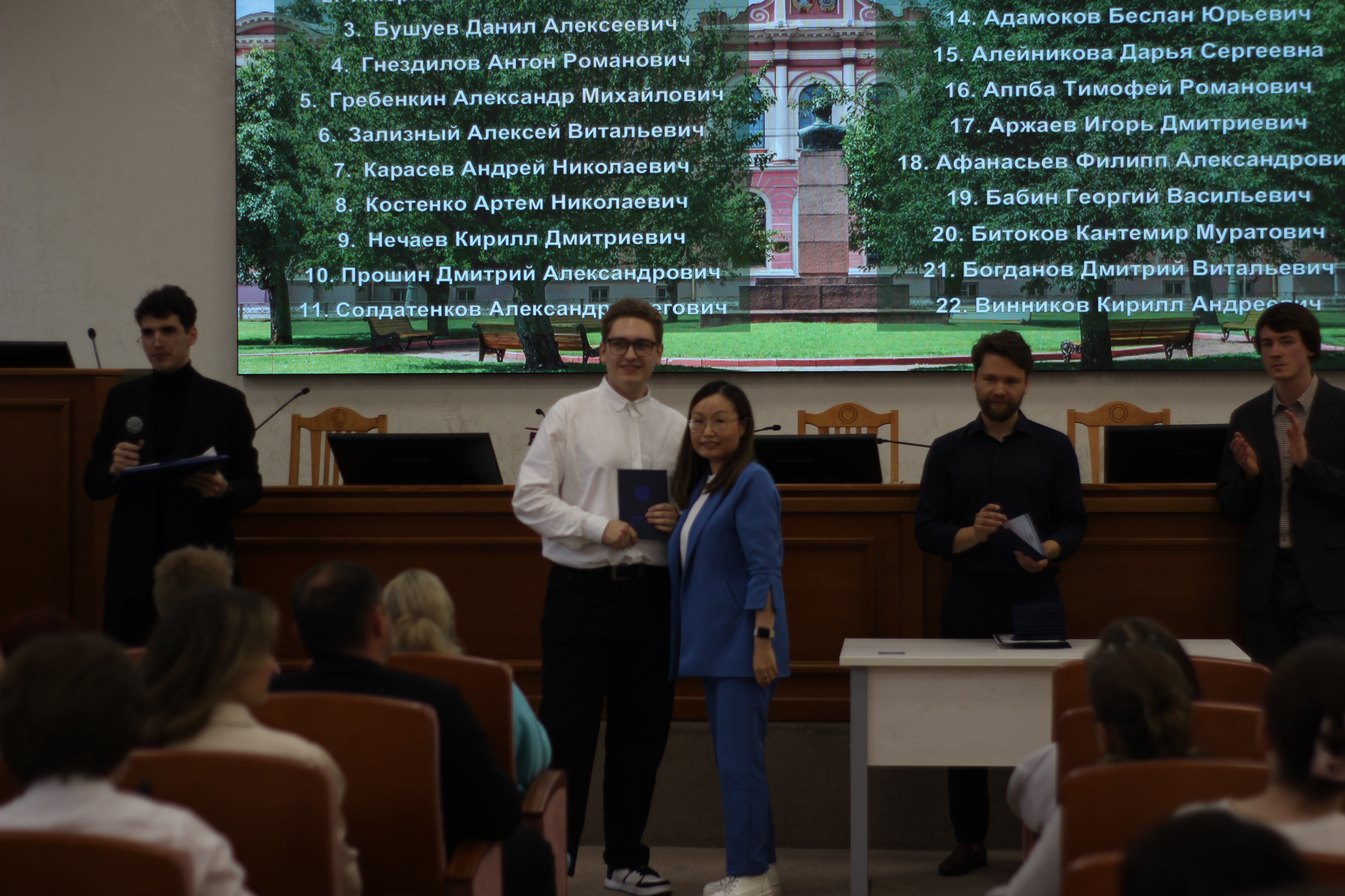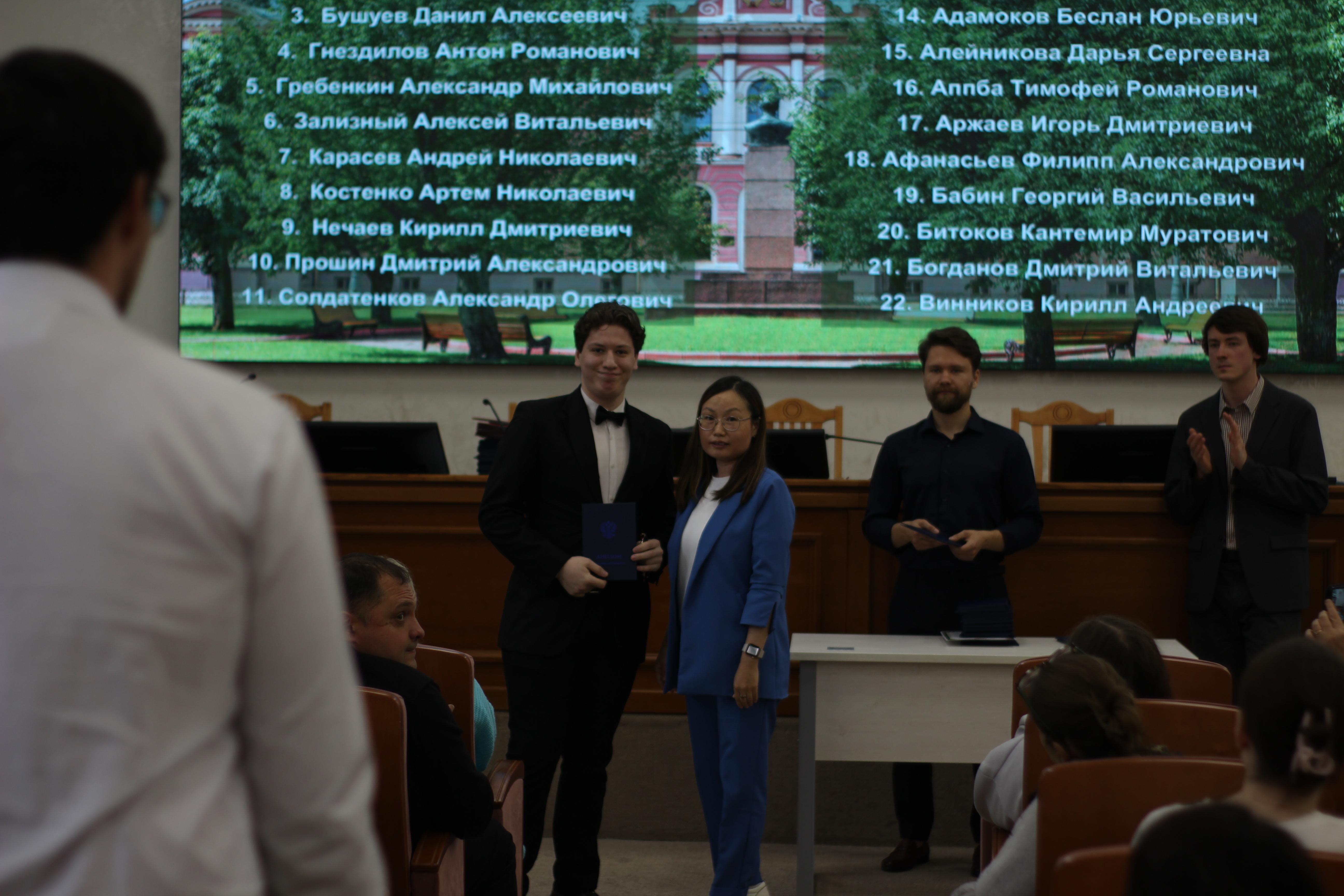 Вручение дипломов началось с поздравлений и пожеланий успехов заведующих кафедрами и кураторов учебных групп. Ведущими мероприятия выступили доцент кафедры статистики и кибернетики Дашиева Б.Ш., ассистенты кафедры статистики и кибернетики Ветошкин А.Ю. и Козлов К.А.