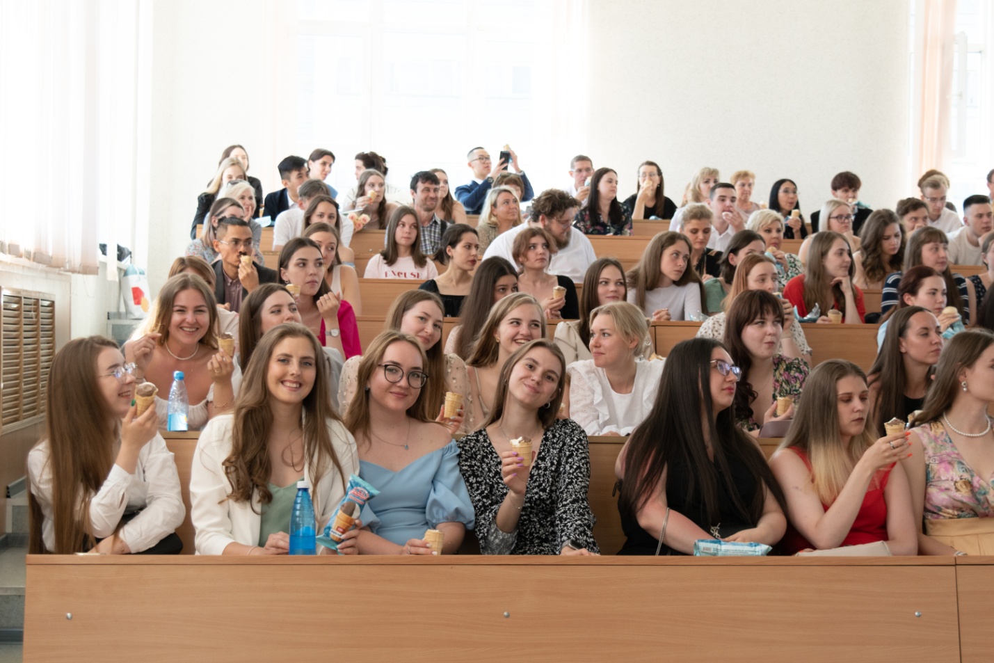 На празднике студентам был подготовлен подарок. В жаркий выпускной день студенты наслаждались мороженым от партнера вуза ОАО «Дмитровский молочный завод».