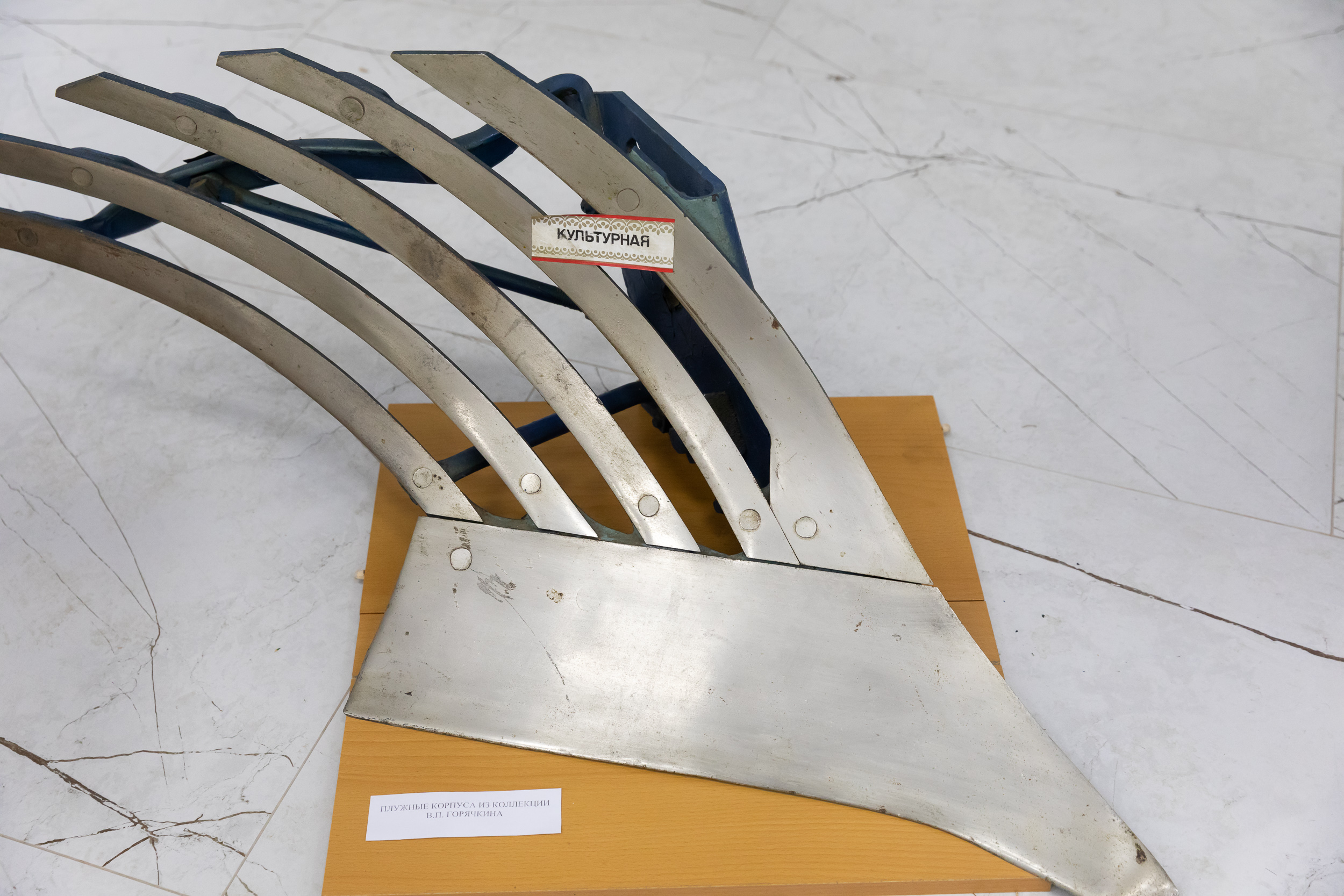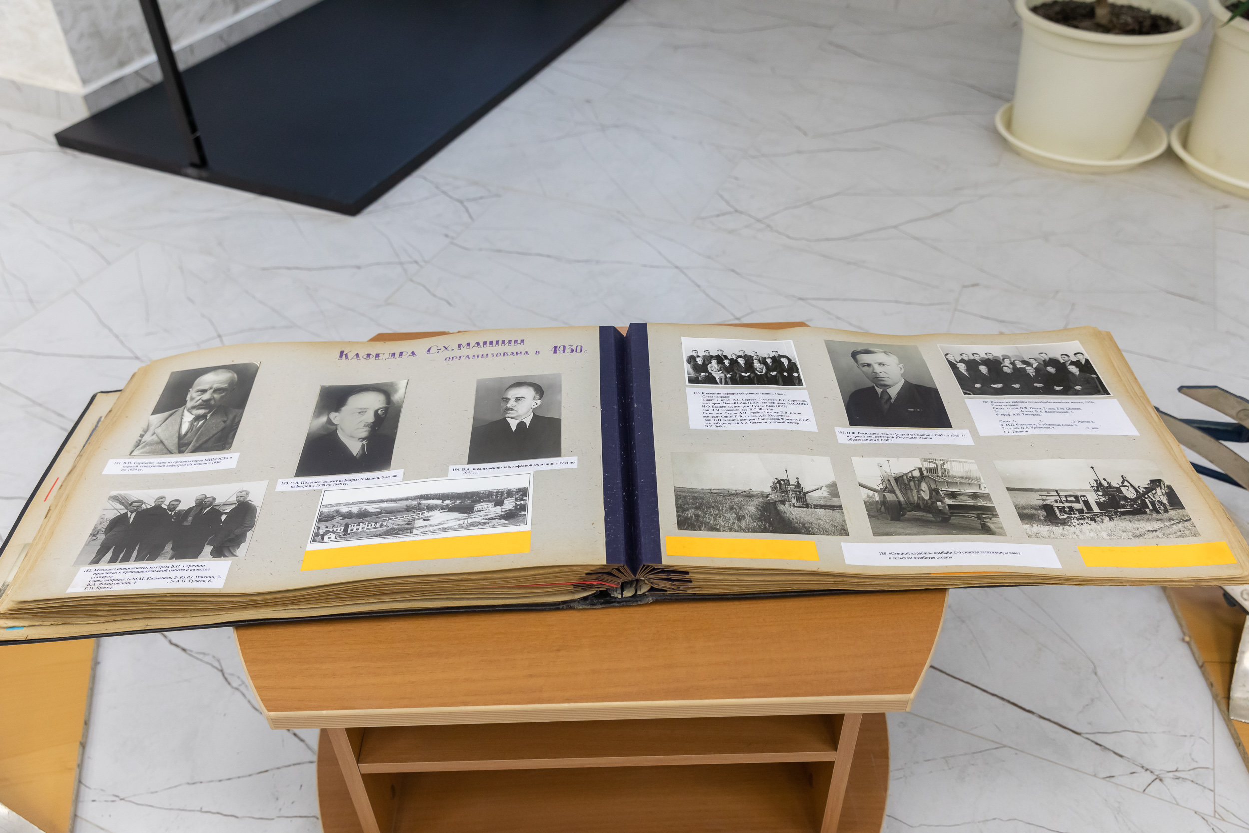 26 Январь / 2022Экспозицию почетным гостям представил заведующий кафедрой сельскохозяйственных машин Николай Васильевич Алдошин. Среди уникальных экспонатов выставки – раритетные фото и издания, чертежи, приборы и даже плужные корпуса из коллекции кафедры.