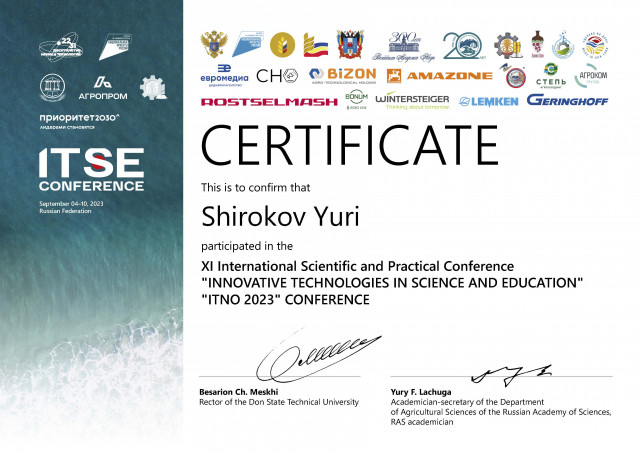 11 Сентябрь / 2023С 4 по 10 сентября 2023 г. Донской государственный технический университет, факультет «Агропромышленный», совместно с Аграрным научным центром «Донской», Южным научным центром РАН, Территориальным кластером «Долина Дона», при поддержке Отделения сельскохозяйственных наук РАН, Министерства науки и высшего образования РФ, Министерства сельского хозяйства РФ, Министерства сельского хозяйства и продовольствия Ростовской области, а также индустриальных партнеров «Lemken», «Wintersteiger», «Amazonen-Werke», «Ростсельмаш» и Агротехнологического холдинга «Бизон» провели X Юбилейную Международную научно-практическую конференцию «Инновационные технологии в науке и образовании» (Конференция «ИТНО 2023») с применением дистанционных технологий.